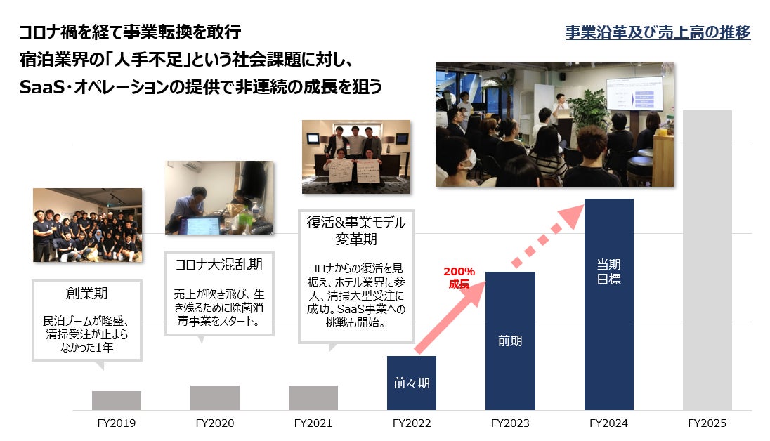 そのような状況下、コロナ後を見据え2021年ホテル客室清掃に参入、東京を中心とした全国に商圏を拡大しました。同時に、民泊清掃時代に取り組んでいた清掃のシステム管理から着想し、ホテル客室清掃管理SaaS「Jtas-ジェイタス-」(以下「Jtas」)の開発に着手。2022年には清掃オペレーションとSaaSを組み合わせた総合的なホテル客室清掃サービスの提供をスタートしました。市場環境も好転、受注拡大し、2022年5月期(前々期)から2023年5月期(前期)にかけては約200%の売上高成長を実現しています。