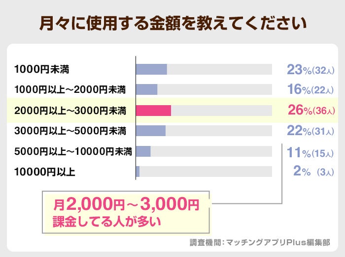 男性利用者のアンケート結果から、月間で2,000円~3,000円ほど課金してる人が多い結果でした。