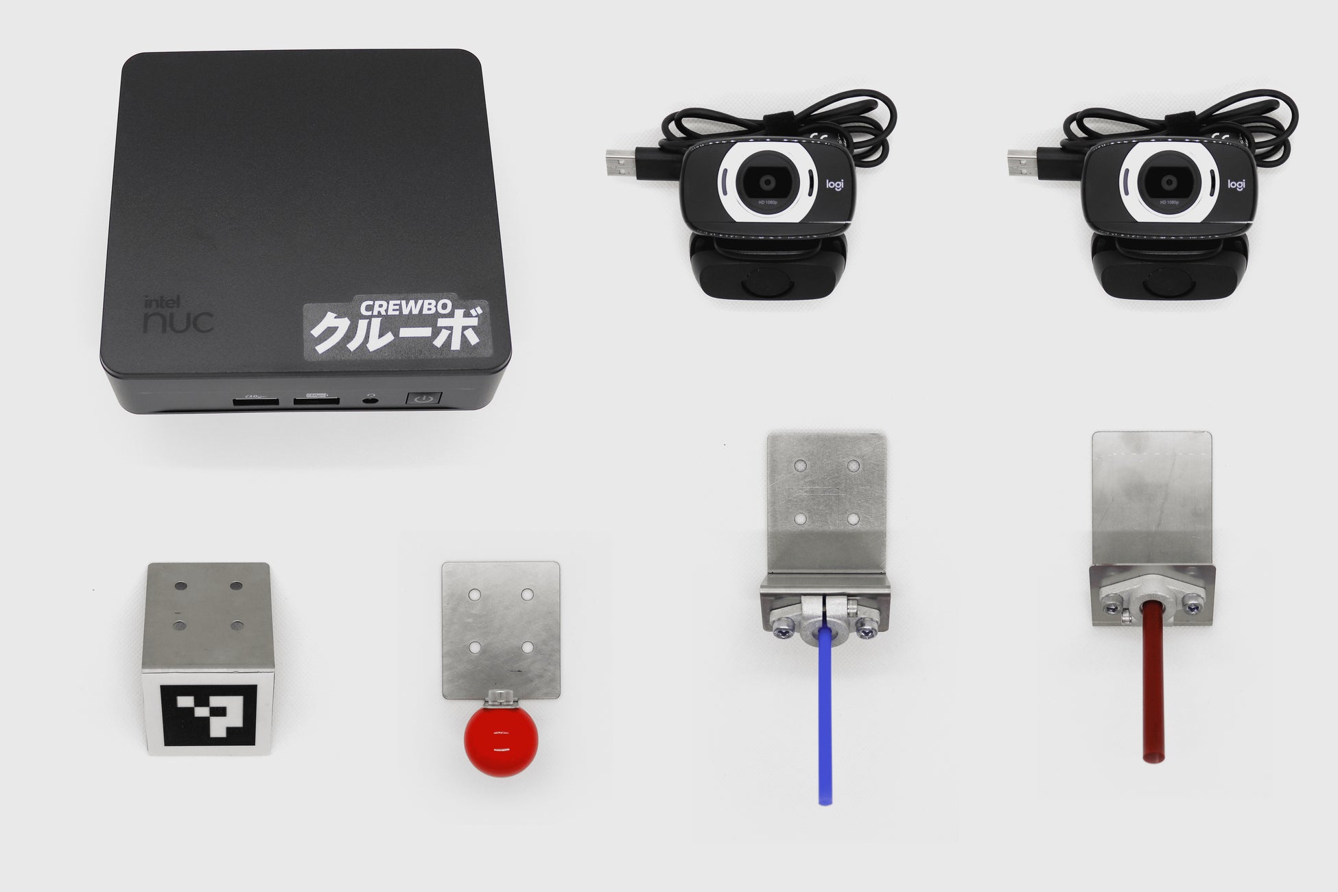 必要なソフトウェアをすべてインストール済みの制御コンピューターの他、チュートリアルで使用するサンプルハンドやワーク、多様な制御に使えるUSBカメラ、クルーボのセットアップから使用方法まで丁寧に説明したスタートアップガイドが標準で付属します。