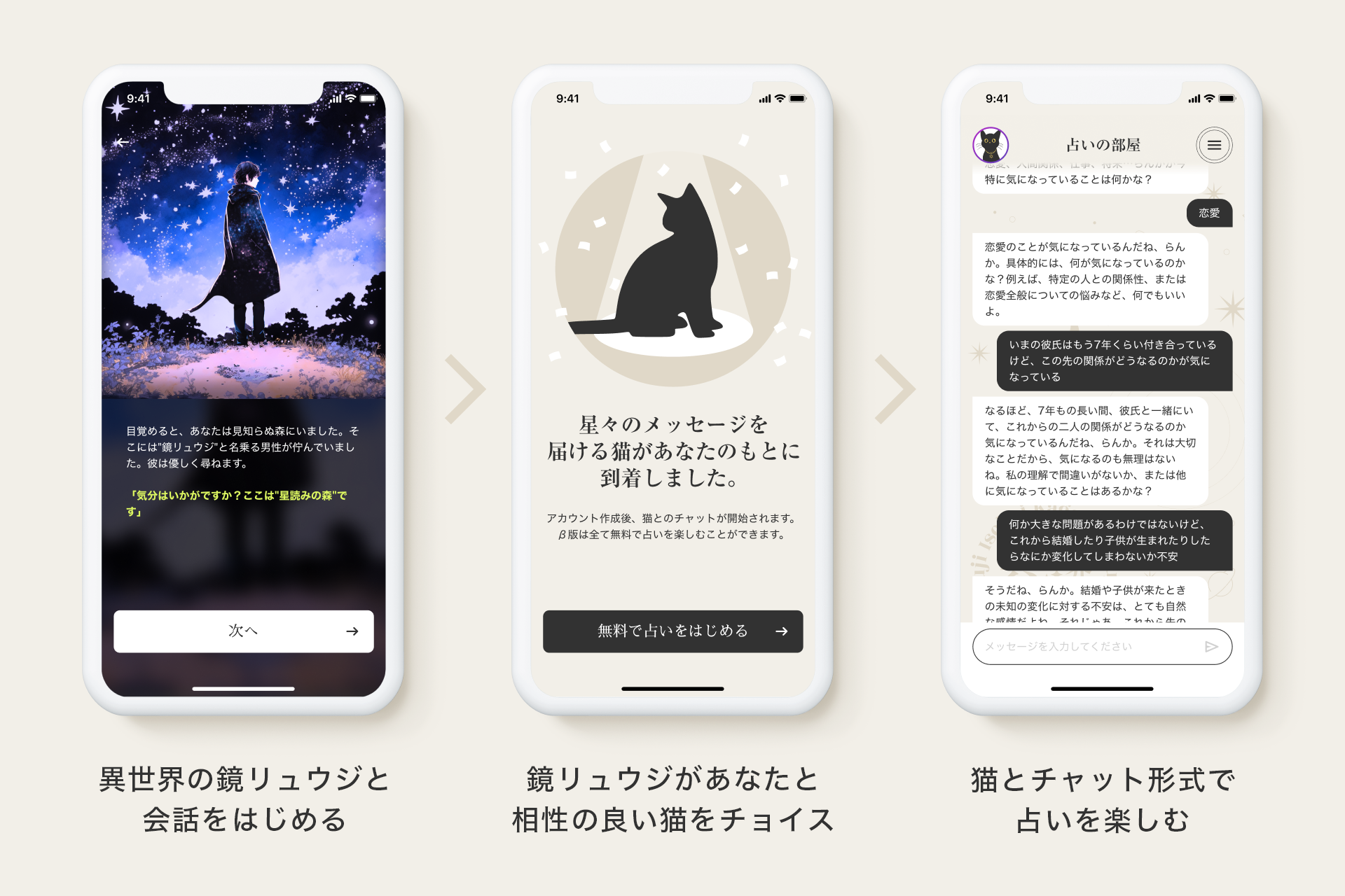 鏡リュウジ監修のAI占星術アプリ『異世界鏡リュウジ』は、異世界で占星術を学ぶ猫たちとチャット形式での会話を楽しみながら、占いの魔法を体験するWebアプリです。