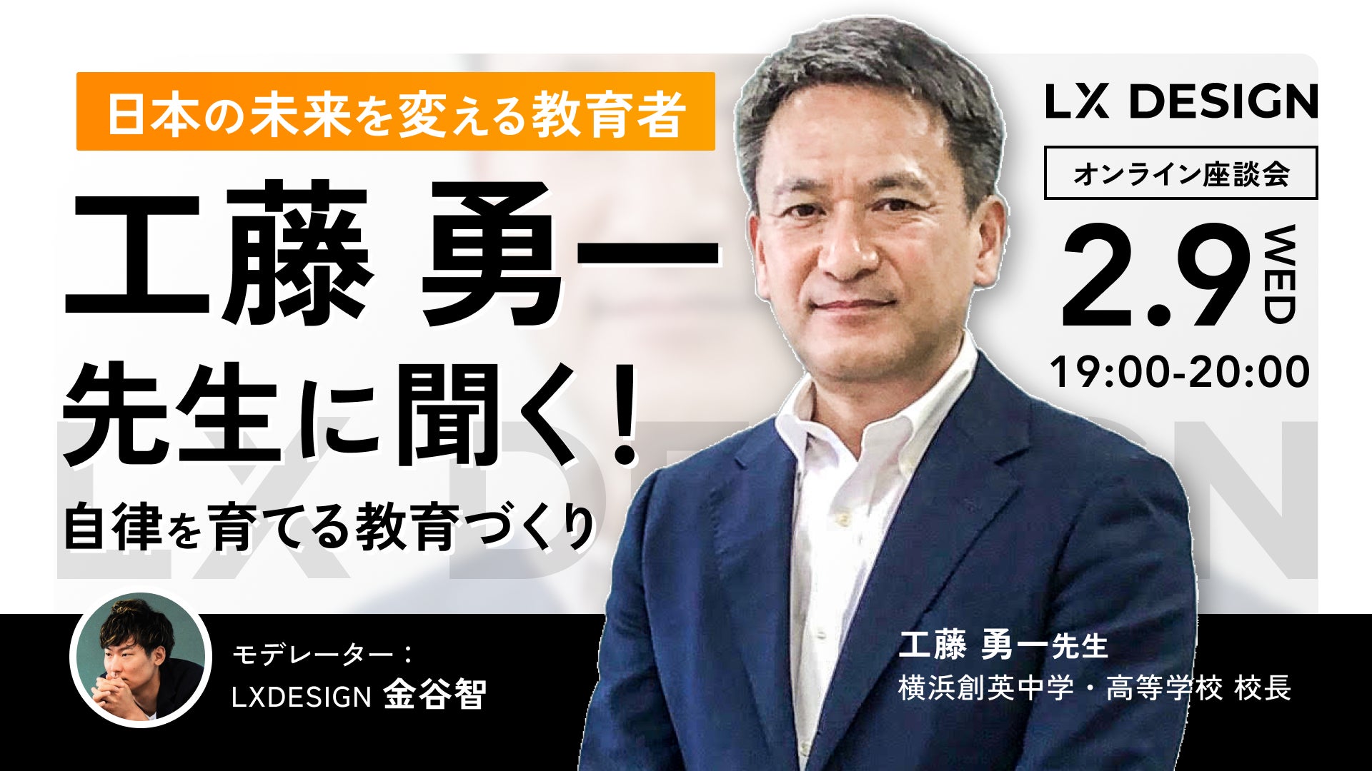 テクノロジーとコミュニティの力で教育現場と社会を繋ぐ株式会社LX DESIGN (本社:東京都千代田区、代表取締役社長:金谷智、以下LX DESIGN) は、2月9日(水)、横浜創英中学・高等学校で校長をされている工藤勇一先生をお招きし、直接工藤先生にご質問できるインタラクティブなオンラインイベント、「日本の未来を変える教育者工藤勇一先生に聞く!『自律を育てる教育づくり』」を開催いたします。
