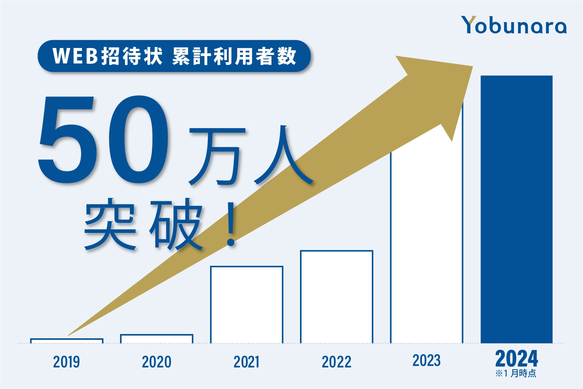 株式会社ココチエ(所在地:東京都港区/代表取締役:糸島求一)が提供している、紙の招待状に代わるWEBサービス『WEB招待状 Yobunara(ヨブナラ)』(https://yobunara.com/)は、2024年1月に、累計利用者数*50万人を突破しました。また2023年の前年比においては、「利用者数」・「会員登録数」・「イベント件数」の全ての項目で、2倍以上の増加となり、昨年から急激に成長しています。