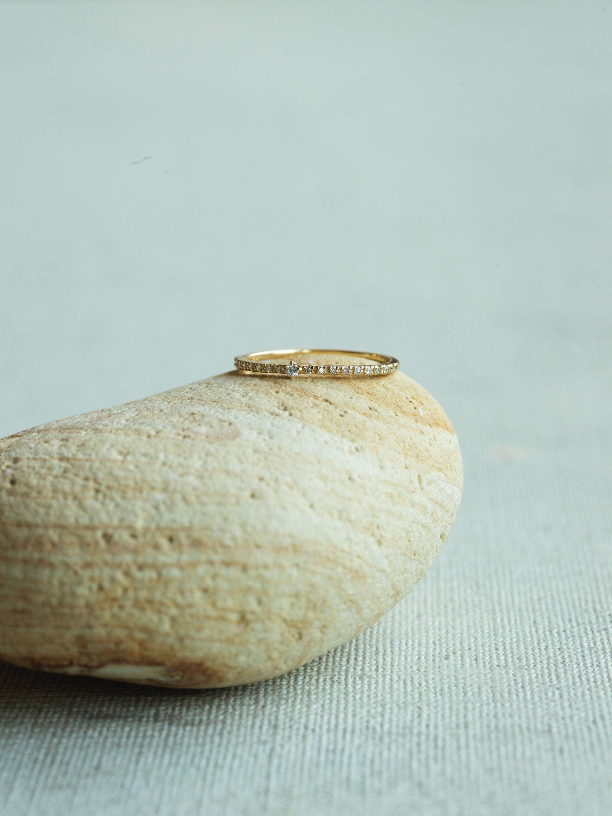 枠付ダイヤモンドを中央に施したデザインは一つでも存在感があり、重ね付けにも合わせやすいボリュームです。