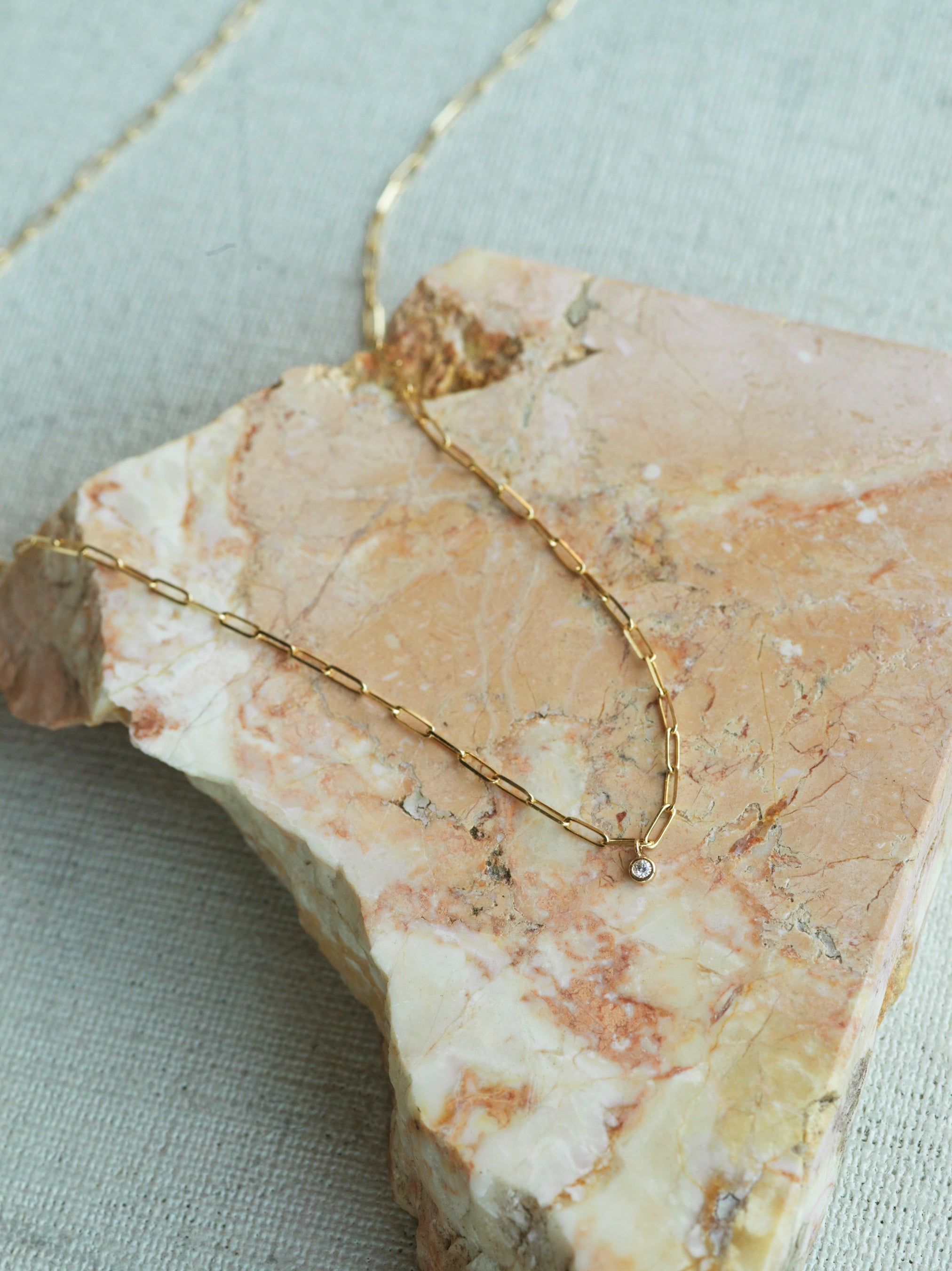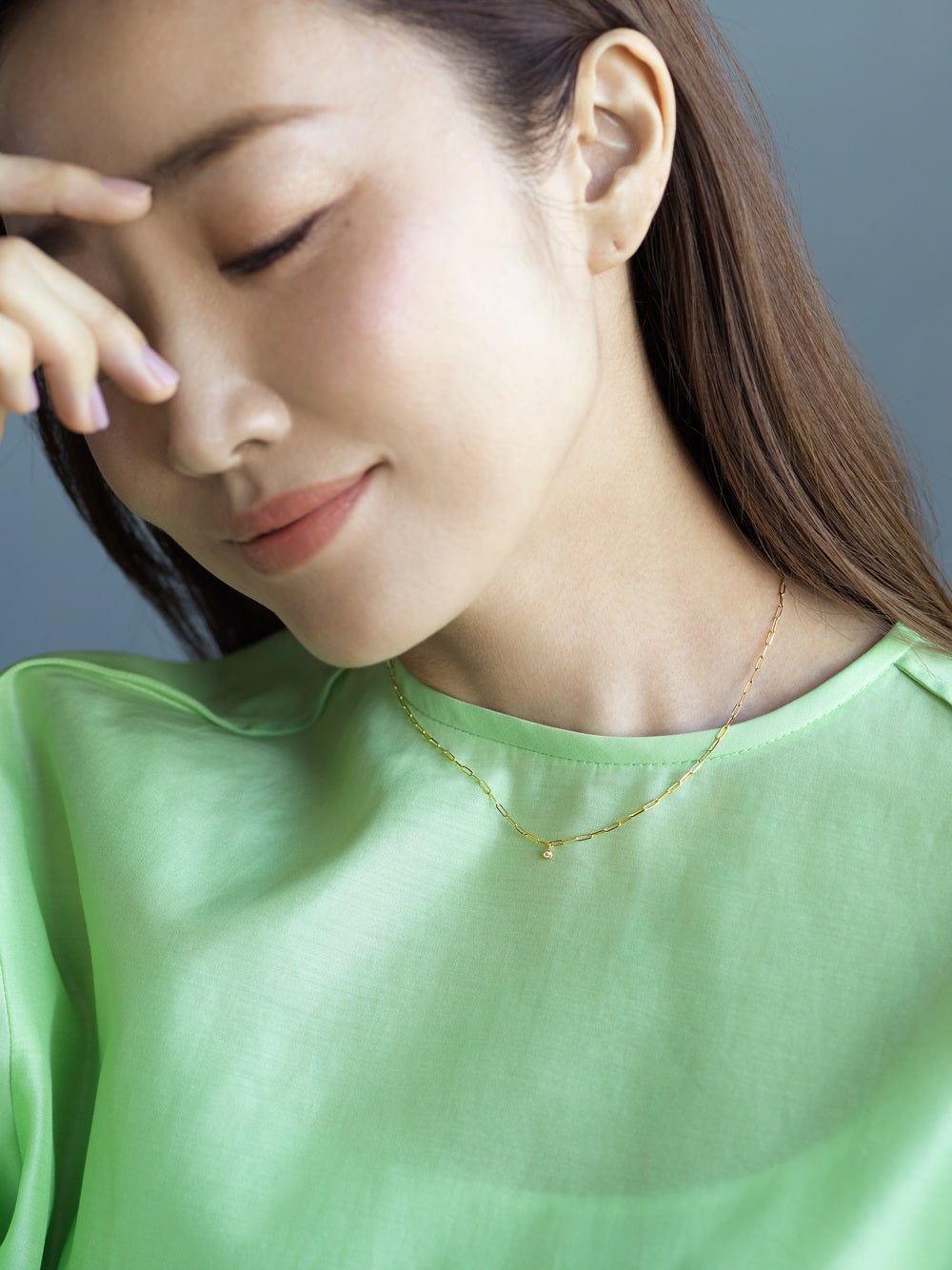細長いスクエアカットチェーンネックレスのトップにダイヤモンドを付けたデザインは、さりげないモード感が漂う洗練された雰囲気。