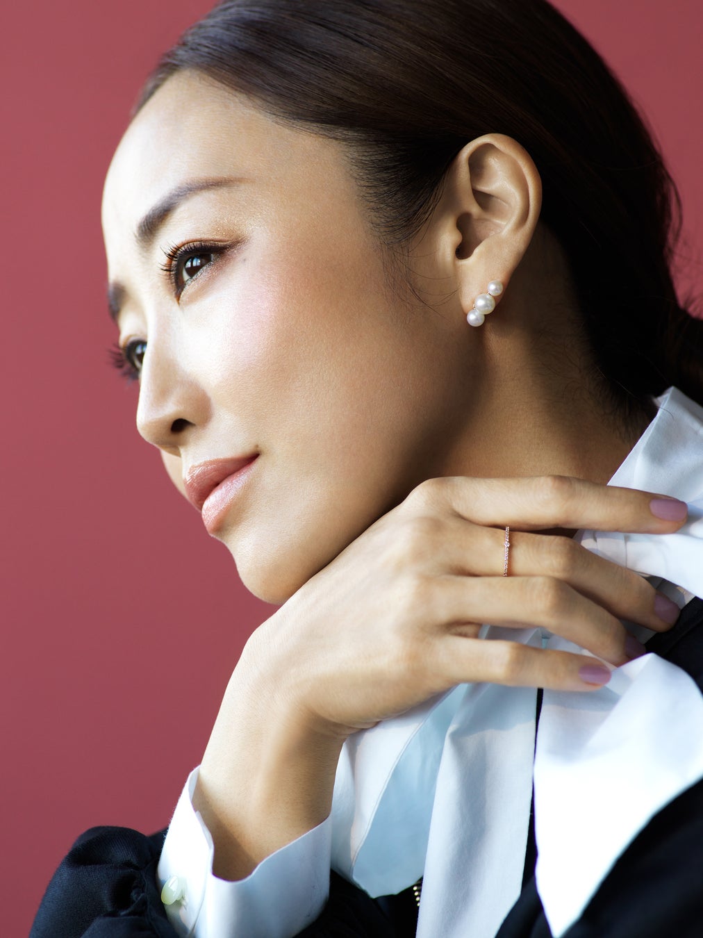 モードやフェミニンを自分らしく着こなす神崎さんのパーソナリティに寄り添うようなジュエリーはles bonbonならではの繊細さに女性らしい凛とした強さを加えた、上品で洗練されたコレクションです。