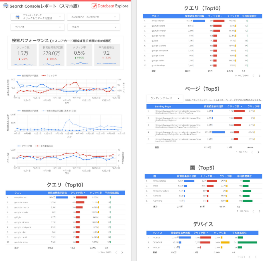 スマホ用サーチコンソール版Looker Studio無料テンプレートで閲覧できる情報