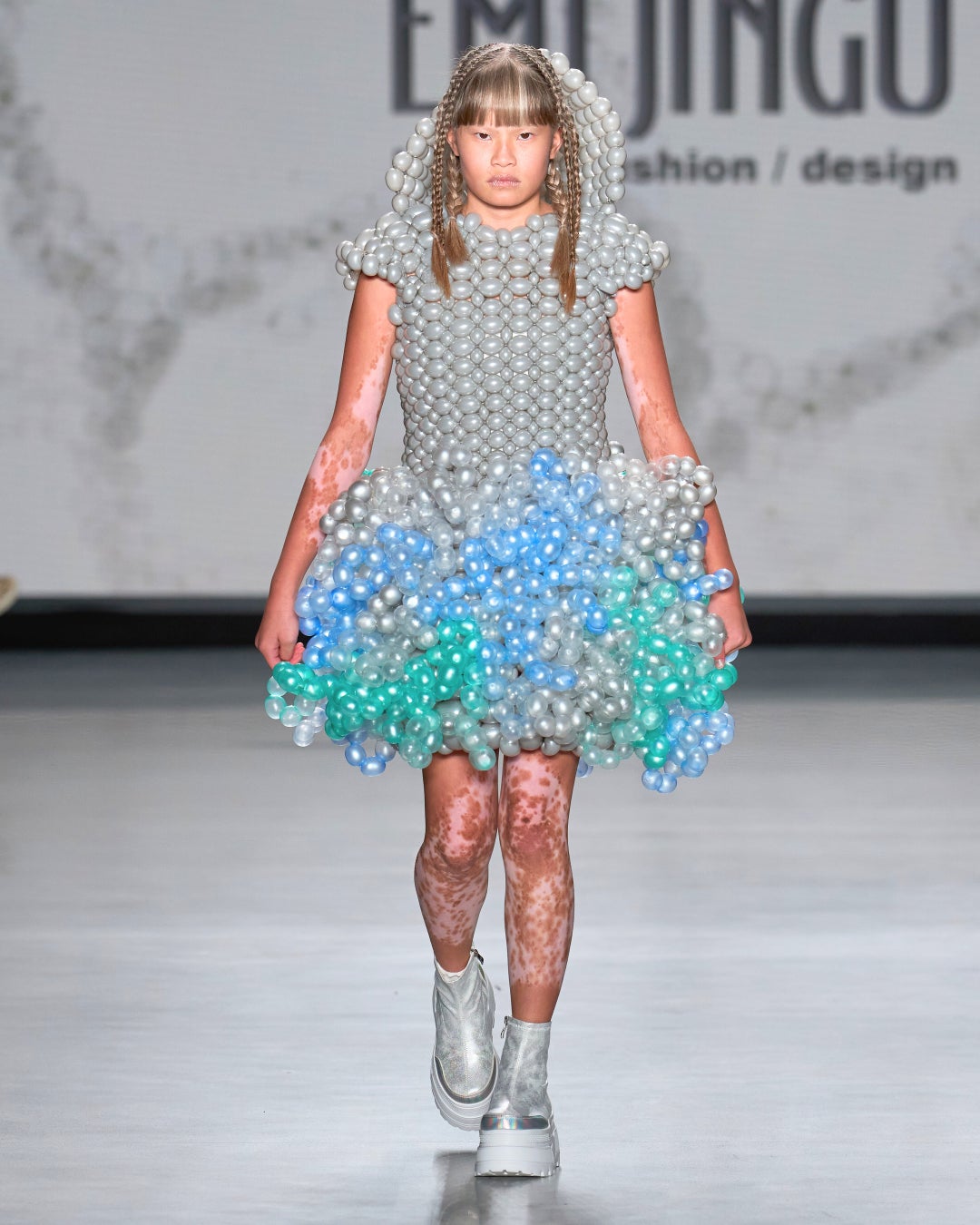 彼女のルックは、透明バルーンに絵の具を閉じ込めて生み出した“まだら模様”で個性を表現し、13歳らしいみずみずしさと未来を予感させる色合いを融合。フードを加えることで遊び心と力強さを両立させ、Ziaの唯一無二の輝きを象徴するデザインとなっています。