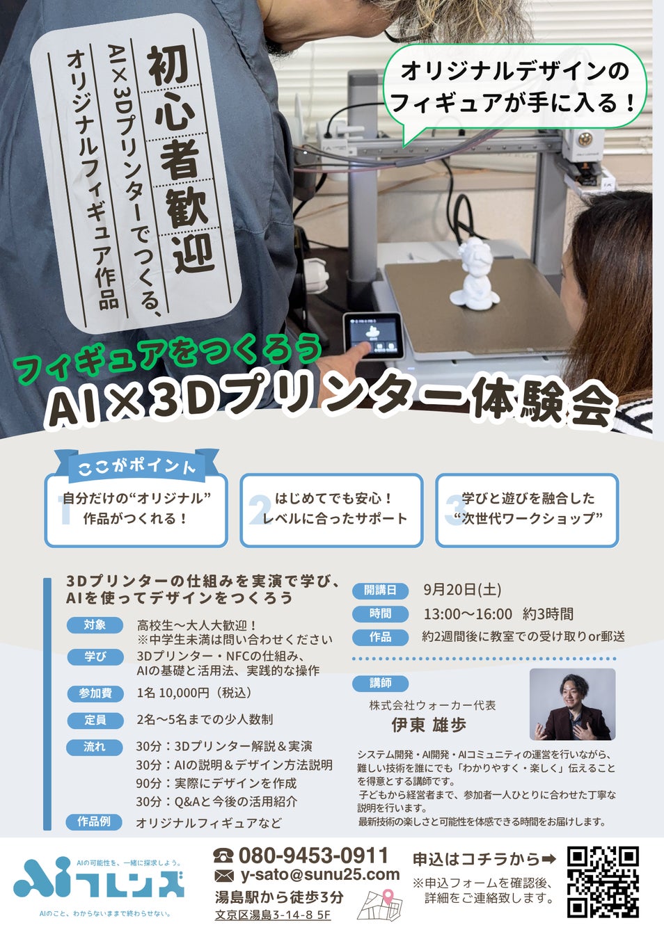 株式会社ウォーカー(本社:東京都文京区、代表取締役:伊東雄歩)は、AIと3Dプリンターを融合した最先端のものづくりワークショップ『フィギュアをつくろう!AI×3Dプリンタ体験会』を、開催致します。