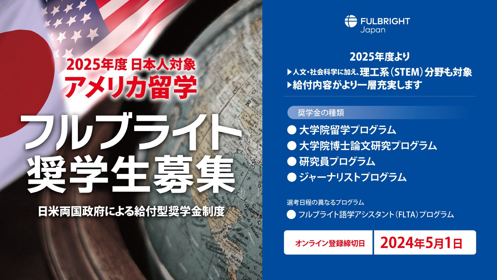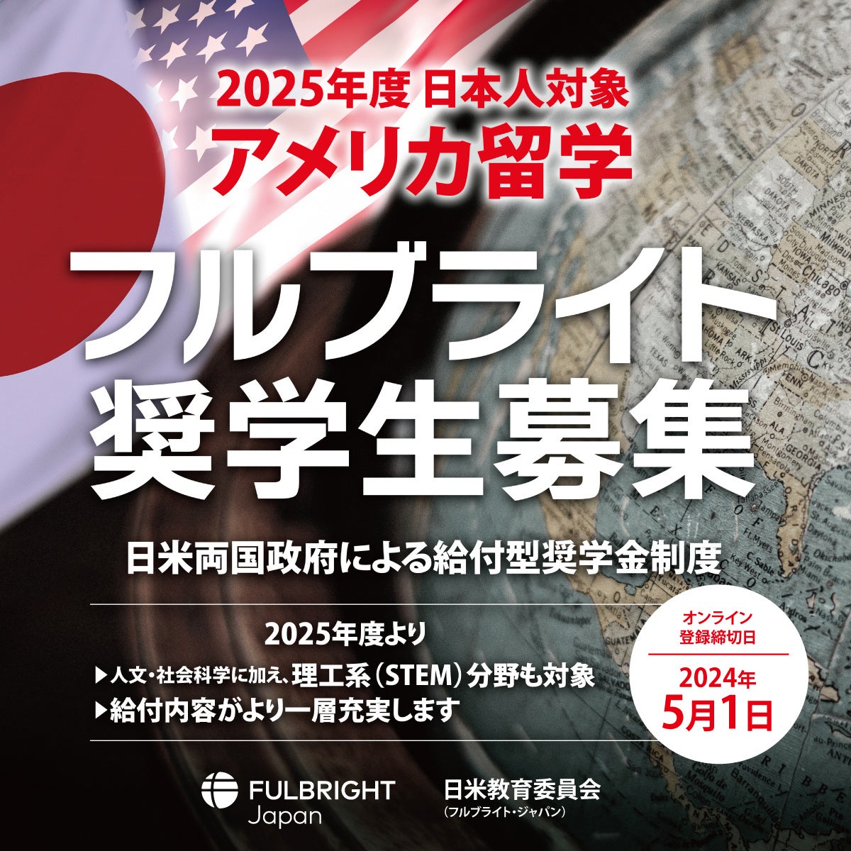 日米両国政府による 給付型 米国留学奨学金制度2025年度 日本人対象 フルブライト奨学生募集