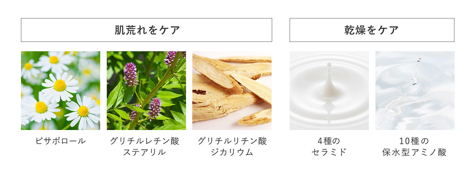 レチノールケア中は肌が乾燥しやすいため、角層内の保水力を整える4種のセラミド(*1)、10種の保水型アミノ酸(*2)を配合。さらに、肌荒れ防止に優れたビサボロール(*3)や、グリチルレチン酸ステアリル(*3)、グリチルリチン酸ジカリウム(*4)が、マスク荒れでダメージを受けた肌をやさしくケア。