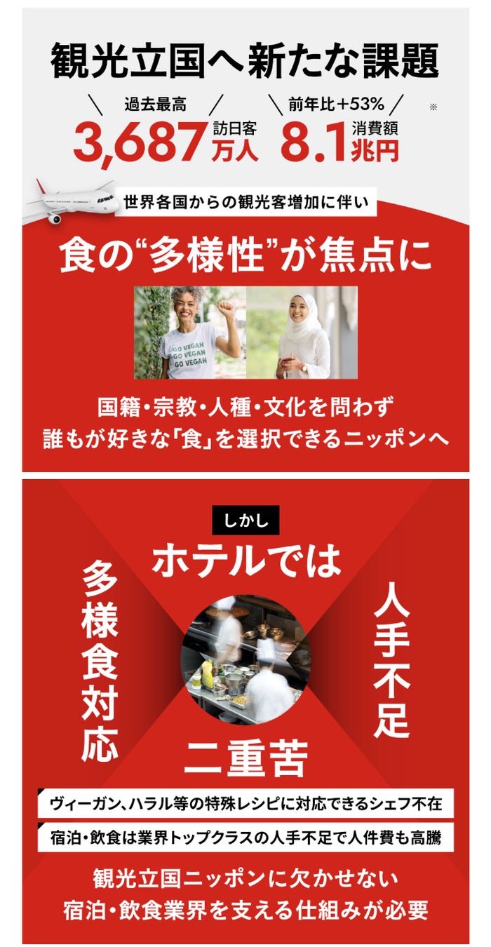 「私たちのソリューションは、単にホテル業界の人手不足や多様食対応の課題を解決するだけではありません。それは、日本の強みである『おもてなし』の心を、食の制約がある方々にも届けることで、より深い感動体験を提供するものです。
