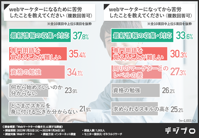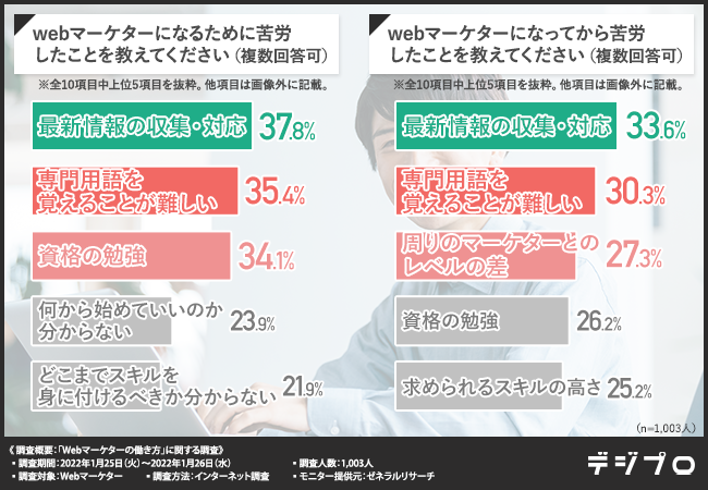 webマーケターになる前もなった後も、苦労することは大きく変わらず、常に新しいものを取り入れ、多くの知識が必要であることが分かる結果となりました。