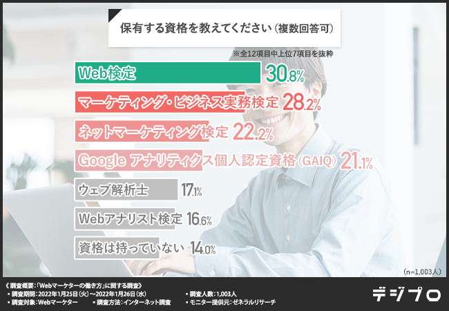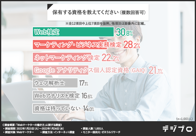 そこで、「保有する資格を教えてください(複数回答可)」と質問したところ、『Web検定(30.8%)』と回答した方が最も多く、次いで『マーケティング・ビジネス実務検定(28.2%)』『ネットマーケティング検定(22.2%)』『Googleアナリティクス個人認定資格(GAIQ)(21.1%)』と続きました。