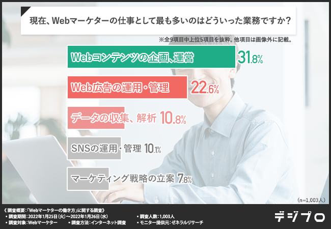 そこで、「現在、Webマーケターの仕事として最も多いのはどういった業務ですか?」と質問したところ、『Webコンテンツの企画、運営(31.8%)』と回答した方が最も多く、次いで『Web広告の運用・管理(22.6%)』『データの収集・解析(10.8%)』と続きました。