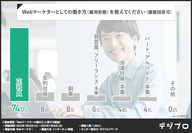 「Webマーケターとしての働き方(雇用形態)を教えてください(複数回答可)」と質問したところ、『正社員(74.0%)』と回答した方が最も多く、次いで『契約社員(8.8%)』『副業(8.1%)』と続きました。
