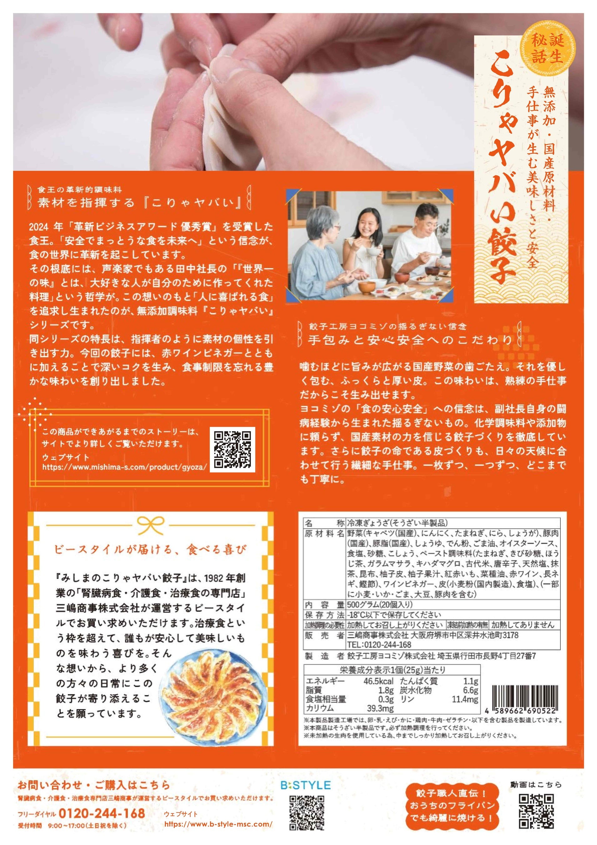 「病気があるから食べられない」と諦めていた方にも、食卓で笑顔になっていただきたいという強い想いから、「手包み餃子」の伝統を守る餃子工房ヨコミゾ(埼玉県)と、厳選素材の旨みを凝縮させたオリジナル調味料を製造する合同会社食王(埼玉県)とタッグを組み、誰もが思わず「こりゃヤバい!」と唸る美味しさの冷凍餃子を完成させました。(さらに詳しい開発ストーリーはこちら)