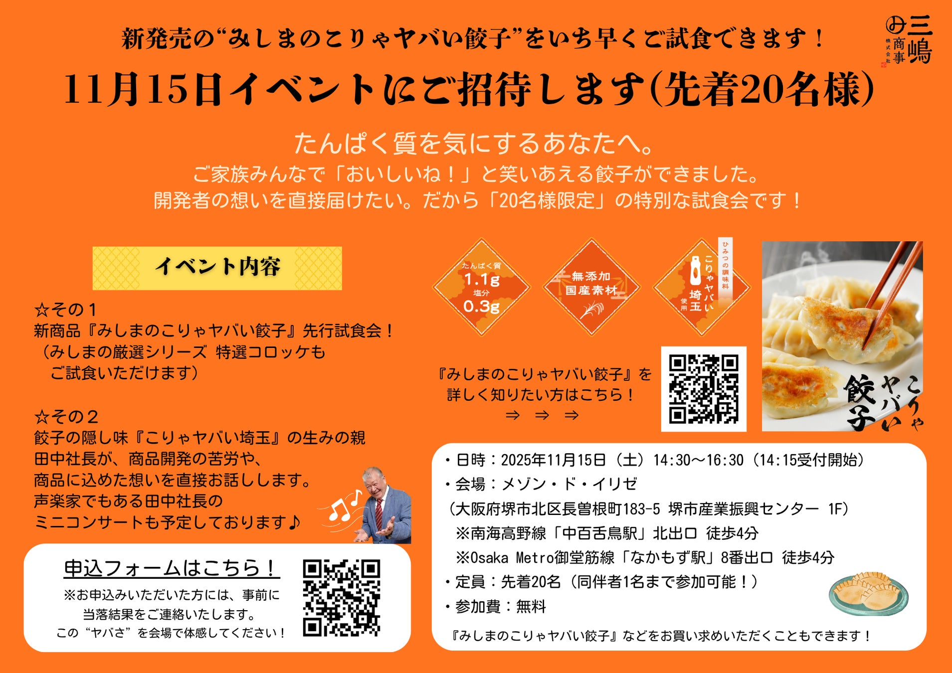 『みしまのこりゃヤバい餃子』の発売を記念し、開発秘話や試食を楽しめる特別イベントを、発売当日に大阪府堺市で開催します。