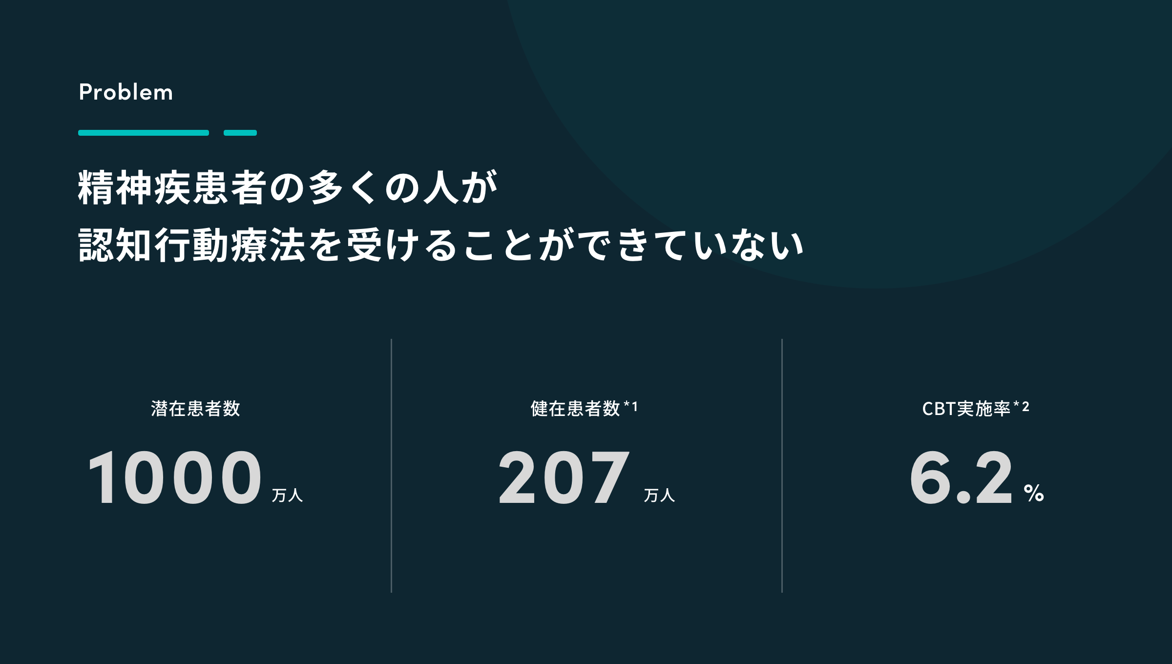 上記の認知行動療法が適用される疾患の年間患者数は、おおよそ207万人(※1)に上ります。 しかし、医療機関で認知行動療法が実施されたのは6.2%(※2)程度と報告されており、ほとんどの患者さんが保険適用内で認知行動療法を受けることができていません。