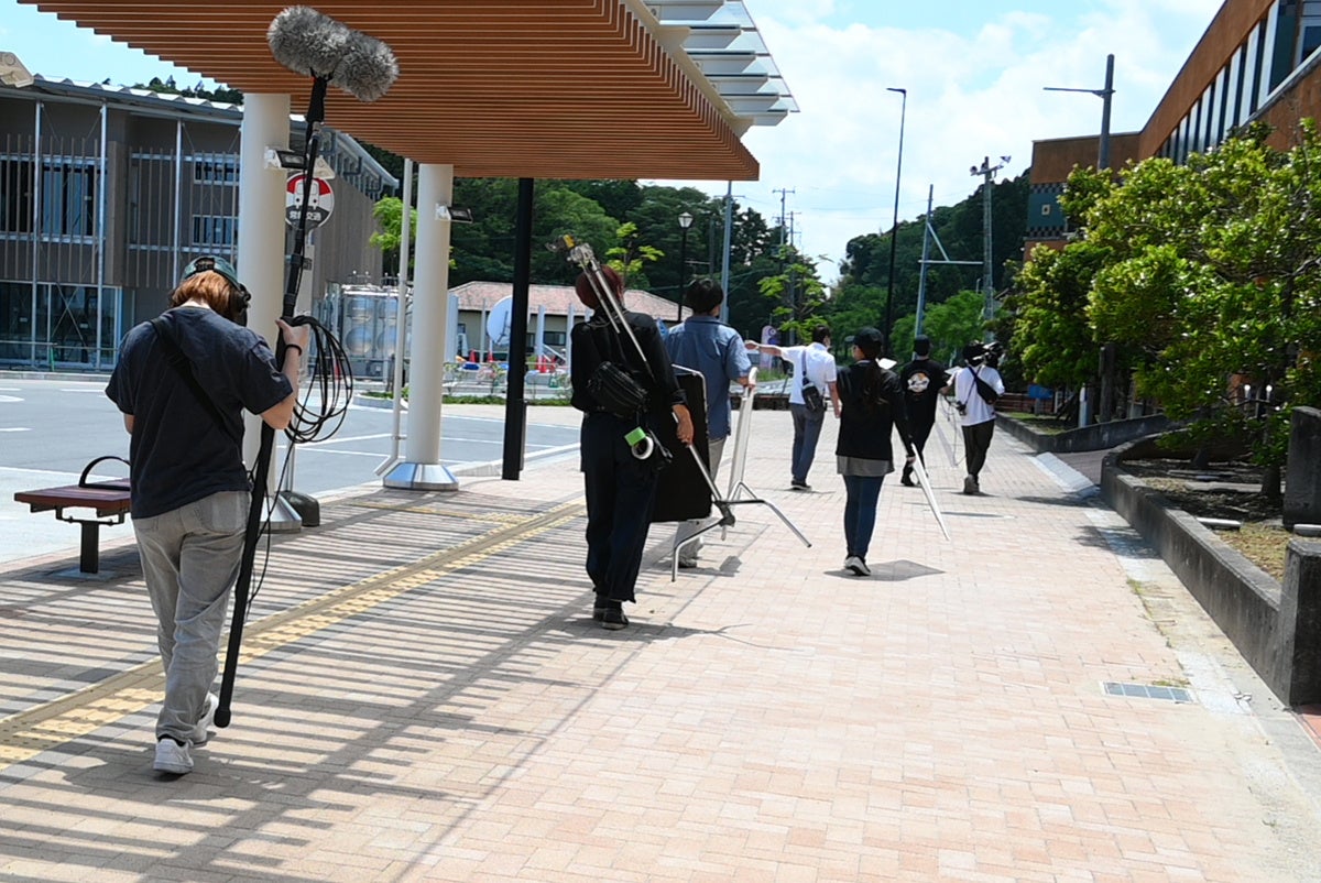 撮影は、6月4日・5日の2日間に渡り、JR双葉駅や東日本大震災・原子力災害伝承館/双葉町産業交流センターの周辺、双葉北小学校、海の家 マリーンハウスふたばなどで行われました。シナリオハンティングに参加した5名のほか、撮影・照明・録音を担当する4名が加わり、監督を同科2年の伊豆倉将宙さんがつとめることになりました。