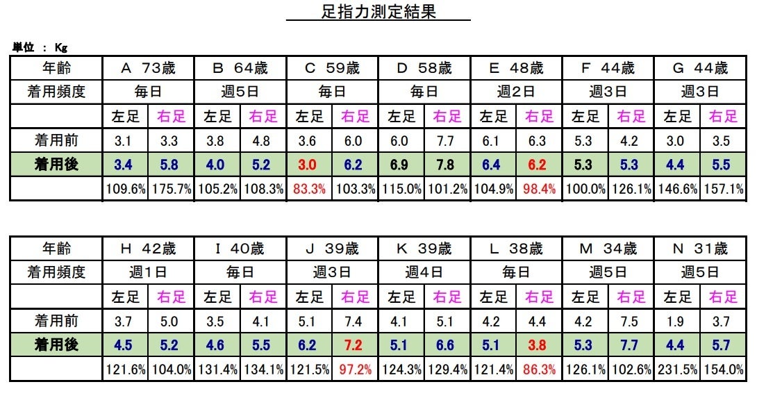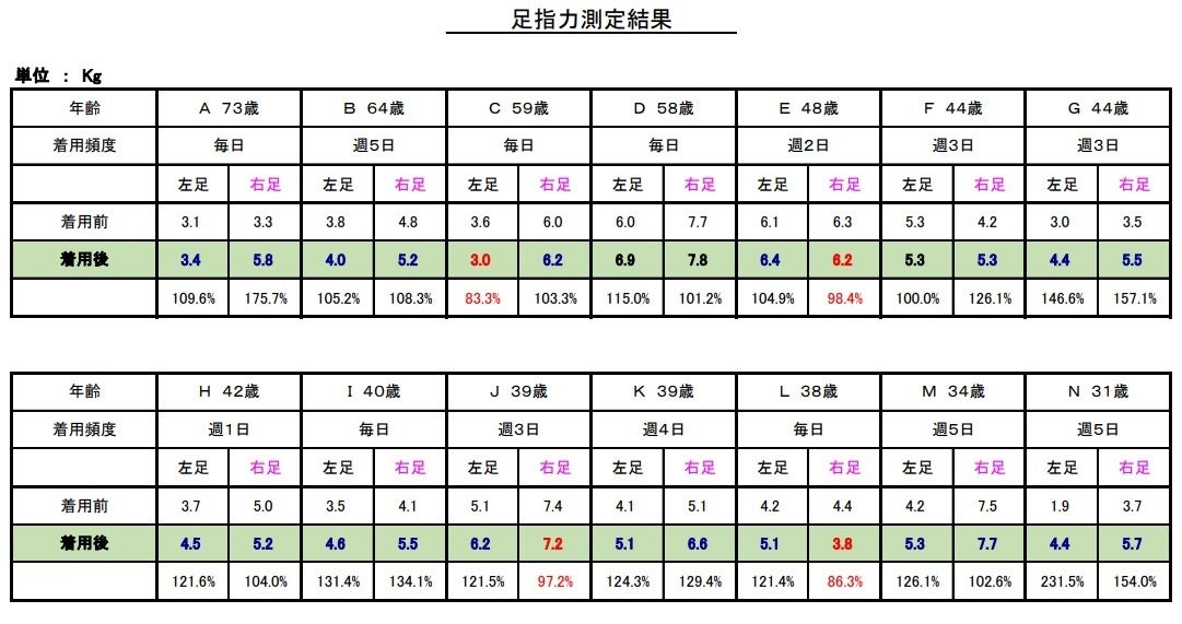 もちろんすべてのモニターにおいて数値向上が見られたわけではなく、着用頻度や歩行時間等も大きくかかわってくると考えられます。