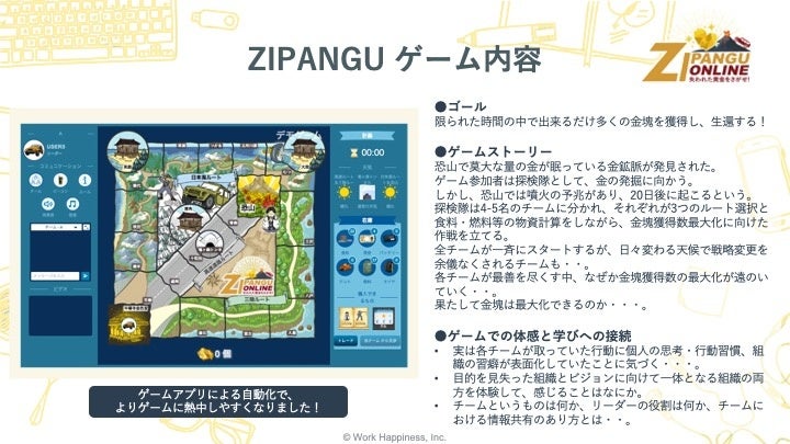 株式会社ワークハピネス(東京都港区、代表取締役:吉村慎吾)は、リモート社会でのチームの生産性やパフォーマンス向上にお困りの企業様向けに、「あるべきリーダーの振る舞い」、「環境激変時のチームのコミュニケーション」、「部分最適から全体最適への視野の拡大」を体験で学習できるオンライン研修「ZIPANGU」を、オンライン環境に最適化されたWEBアプリケーションで実施するラーニングゲームへ大幅アップデートを行いました。
