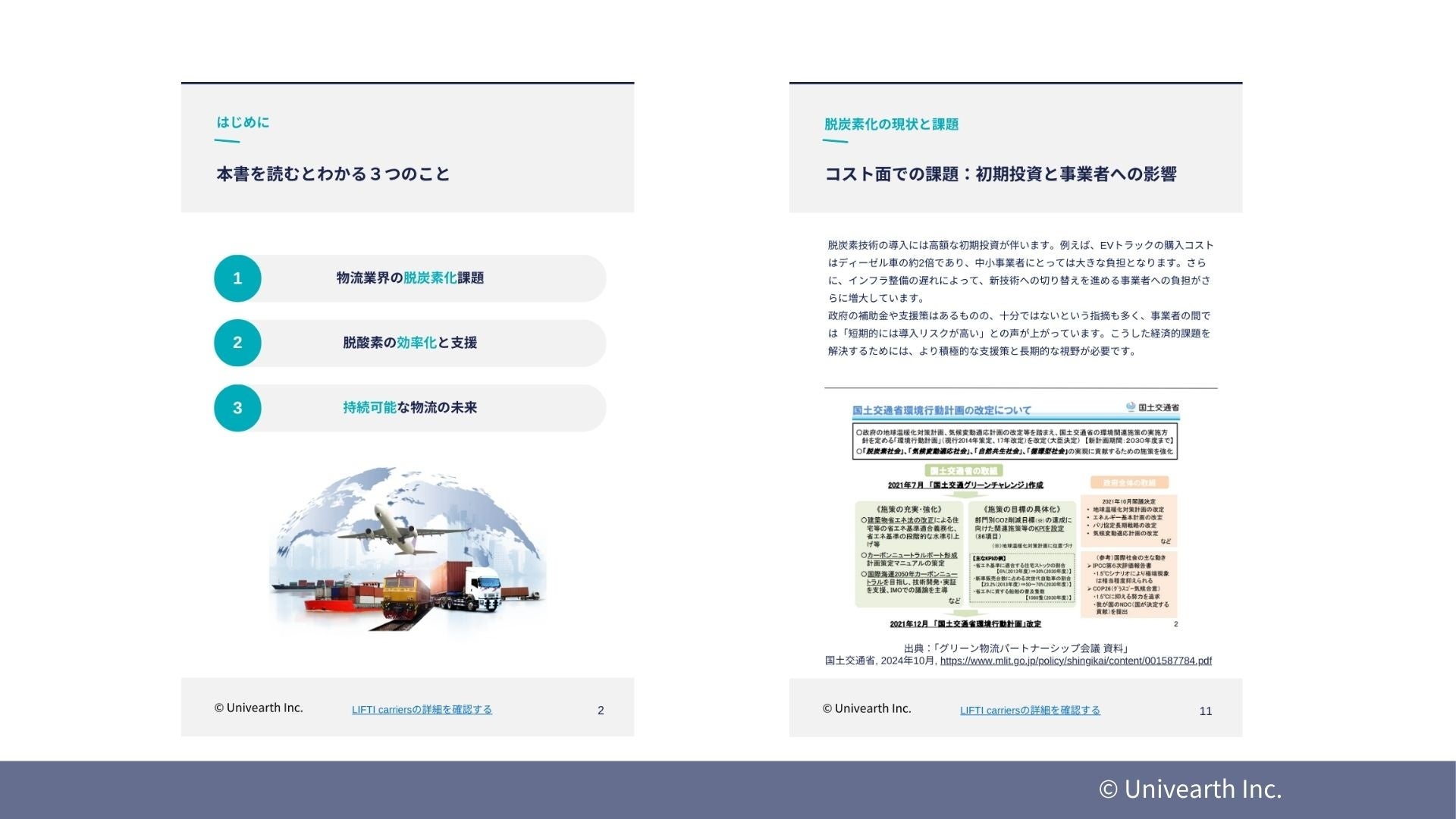 加えて、物流業界は燃料費の高騰、ドライバー不足、そして労働時間規制強化など、多くの構造的な課題に直面しています。脱炭素化に向けた新技術(EVトラック、FCVトラック等)導入には高額な初期投資やインフラ不足といった壁も存在します。 このような複雑な状況下で、コストを抑制しつつ環境規制に対応し、サプライチェーン全体の競争力と持続可能性を高めるには、現実的かつ効果的な打ち手が不可欠です。Univearthは、これらの課題解決の一助となるべく、本ホワイトペーパーを作成いたしました。
