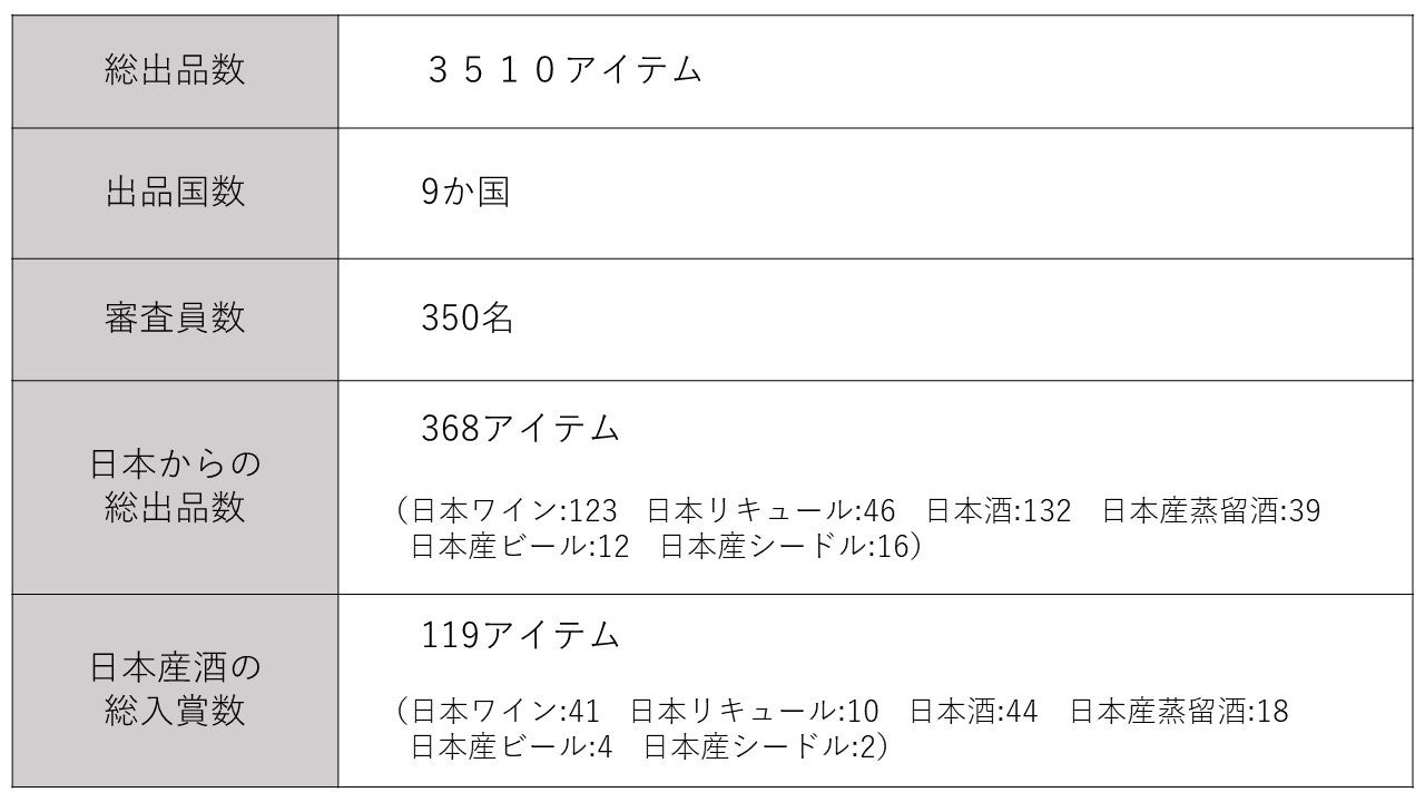 2020年:世界から4470アイテムの出品。日本からは176アイテム出品。うち日本ワインが50アイテム(赤21アイテム、白25アイテム、スパークリング4アイテム)、日本リキュールが30アイテムの出品。同年から増設された「日本酒部門」には、96アイテムの出品(うち純米大吟酒31、純米吟醸酒23、純米酒23、熟成酒7、スパークリン酒12)。