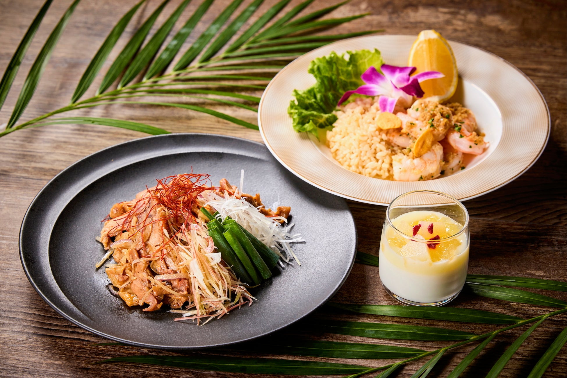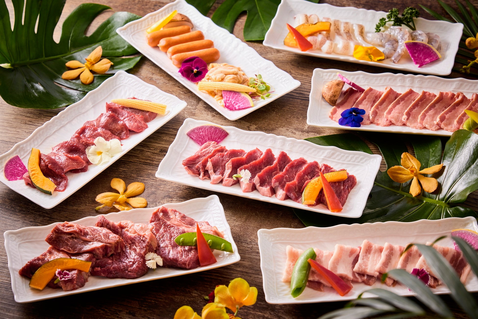 各テーブルで焼き上げるグリルはビーフやポークなどのお肉、シーフード、野菜などが食べ放題でお楽しみいただけます。また、前菜やサラダ、フライやカレーなどの定番料理のほか、今季のテーマである「南国リゾート」を彷彿とさせるお料理(内容は月替わり)が並ぶブッフェもすべて食べ放題です。