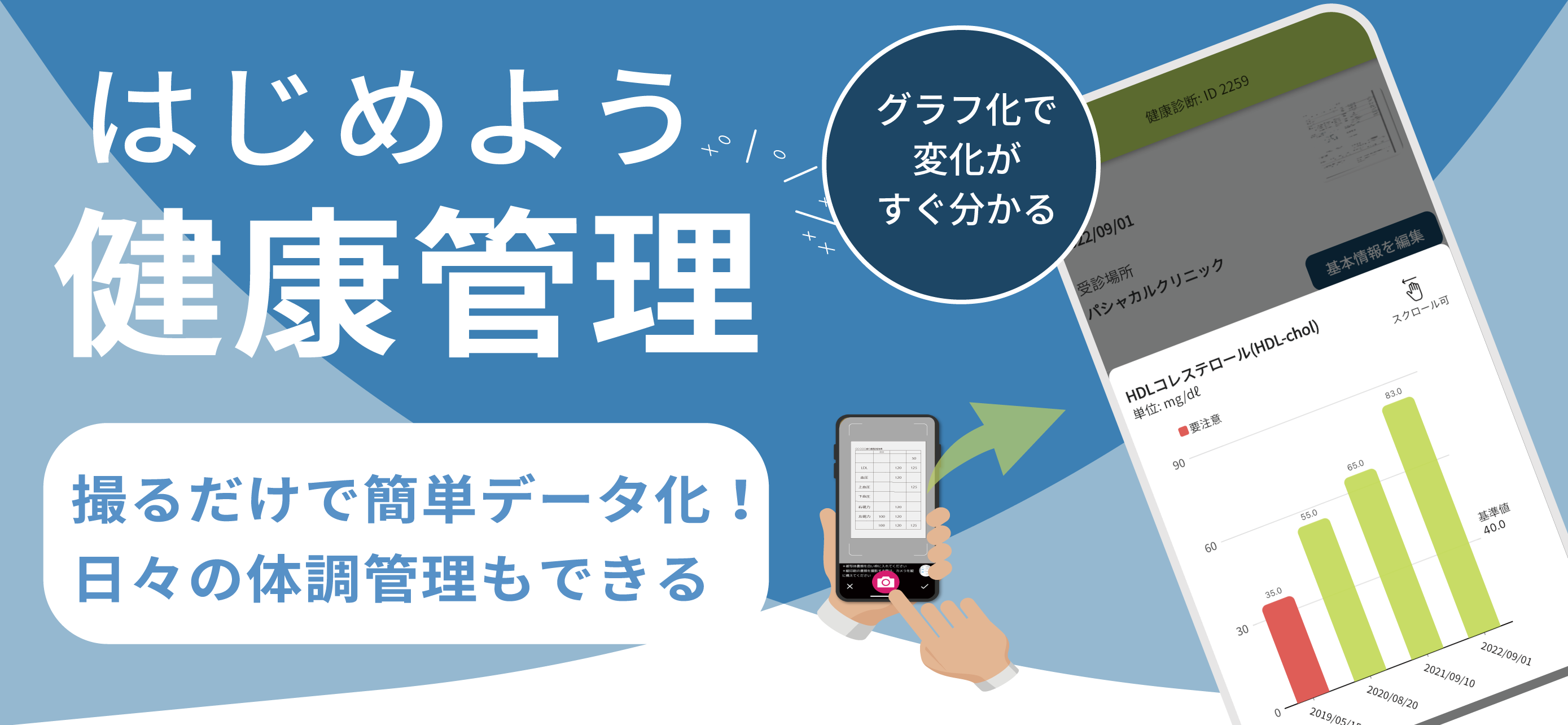 - 異なる形式の医療情報(様々な場所で受診した健康診断の結果等)のデータ化が可能です。