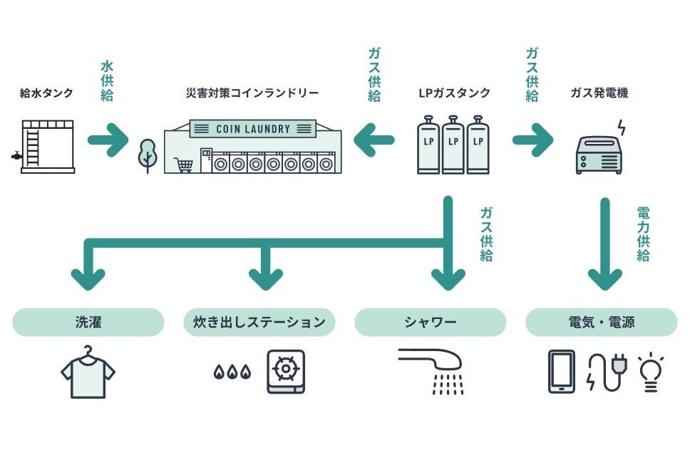災害時における「衣類の洗濯」への重要性を踏まえ、生活に最低限必要な衣類の洗濯・乾燥を店舗にてご利用いただけます。LPガスを使用することで、コインランドリーでの洗濯、炊き出しステーション、シャワー、電気・電源を提供します。
