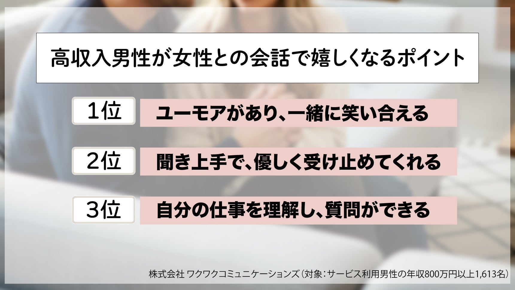 そこで、日本最大級の恋愛マッチングサービス「ワクワクメール(https://550909.com/)(運営:株式会社 ワクワクコミュニケーションズ)」を利用している、年収800万円台〜2,000万円台の男性1,613名を対象としたアンケートを実施。