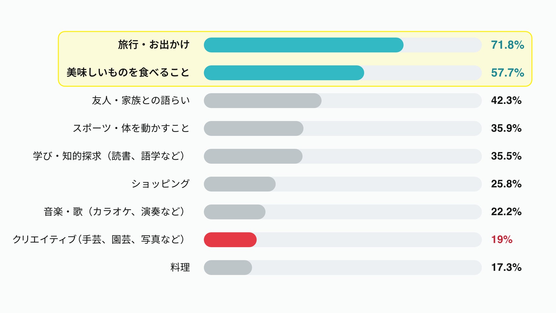 一生楽しみたい趣味のトップは「旅行・お出かけ(71.8%)」。シニアのイメージとして描かれがちな「手芸・園芸などのクリエイティブ」は19.0%にとどまり、シニアの関心が強く「外(体験)」に向かっていることが判明。 -