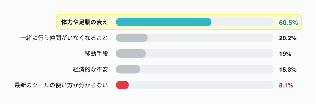 楽しみを阻む不安要素のトップは「体力や足腰の衰え(60.5%)」。対して、「最新ツールの使い方がわからない」というデジタル不安はわずか8.1%と、全項目で最低水準に。 -