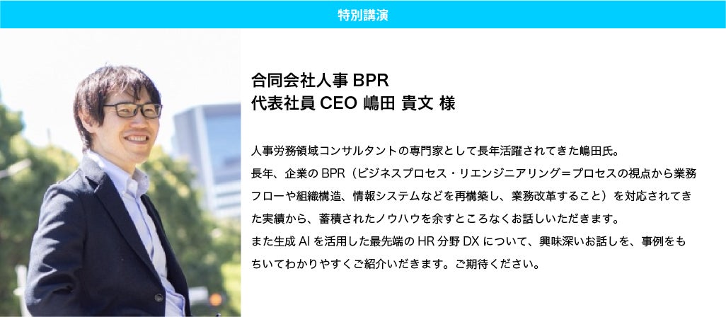 「労務BPRと生成AI活用によるHRDX」をテーマに、合同会社人事BPR 代表社員CEO 嶋田 貴文 様に講演いただきます。