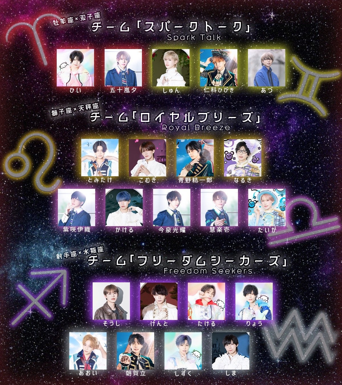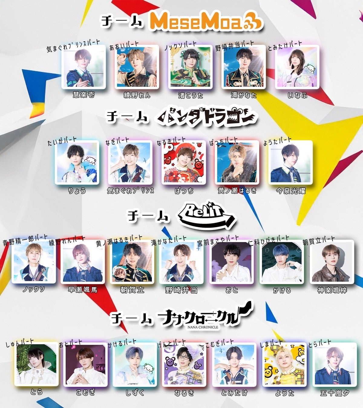 紫咲伊織(ラ) かける(ナ)・今泉光耀(ラ)・慧楽壱(ラ)・たいが(パ)