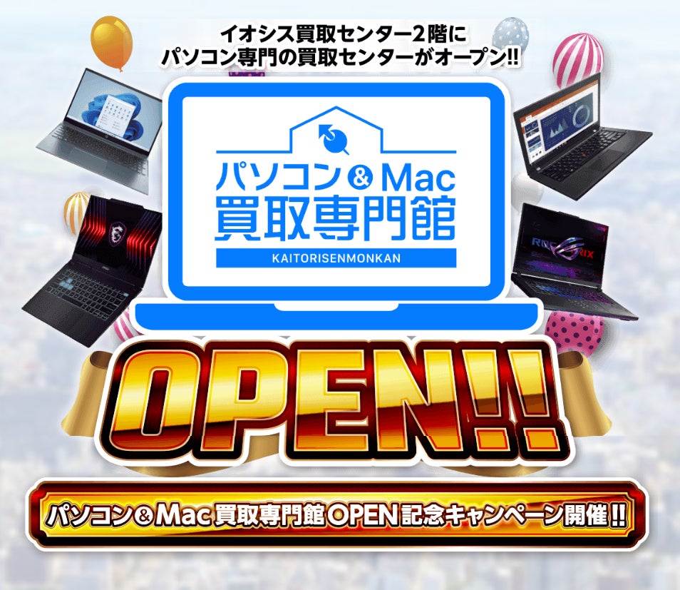「けっこう高い。」の看板のもと、IT機器の買取事業を営んできたイオシスは、近年スマホやタブレットの急速な需要拡大に伴い、同端末の買取・販売ショップとして様々なマスメディアに取り上げていただき、その期待に応えるべく当事業を推進してまいりました。それと同時に、イオシスの源であるパソコンも一定のニーズをいただきながら買取と販売を続けてきた中、2025年10月をもってWindows10のサポートが終了される旨が発表されました。そこでイオシスは、Windows11に対応するパソコンに買い替える方へ向けて、使い終わったパソコンの売却先としてより多くの方に認知いただき、ひいてはITリユース業界の更なる活性化に貢献すべく、イオシスが最も多く実店舗を構える秋葉原にパソコン&Mac買取専門館を新規オープンする運びとなりました。つきまして、当館のオープンを記念して2つの大変お得な買取キャンペーンを開催いたします。