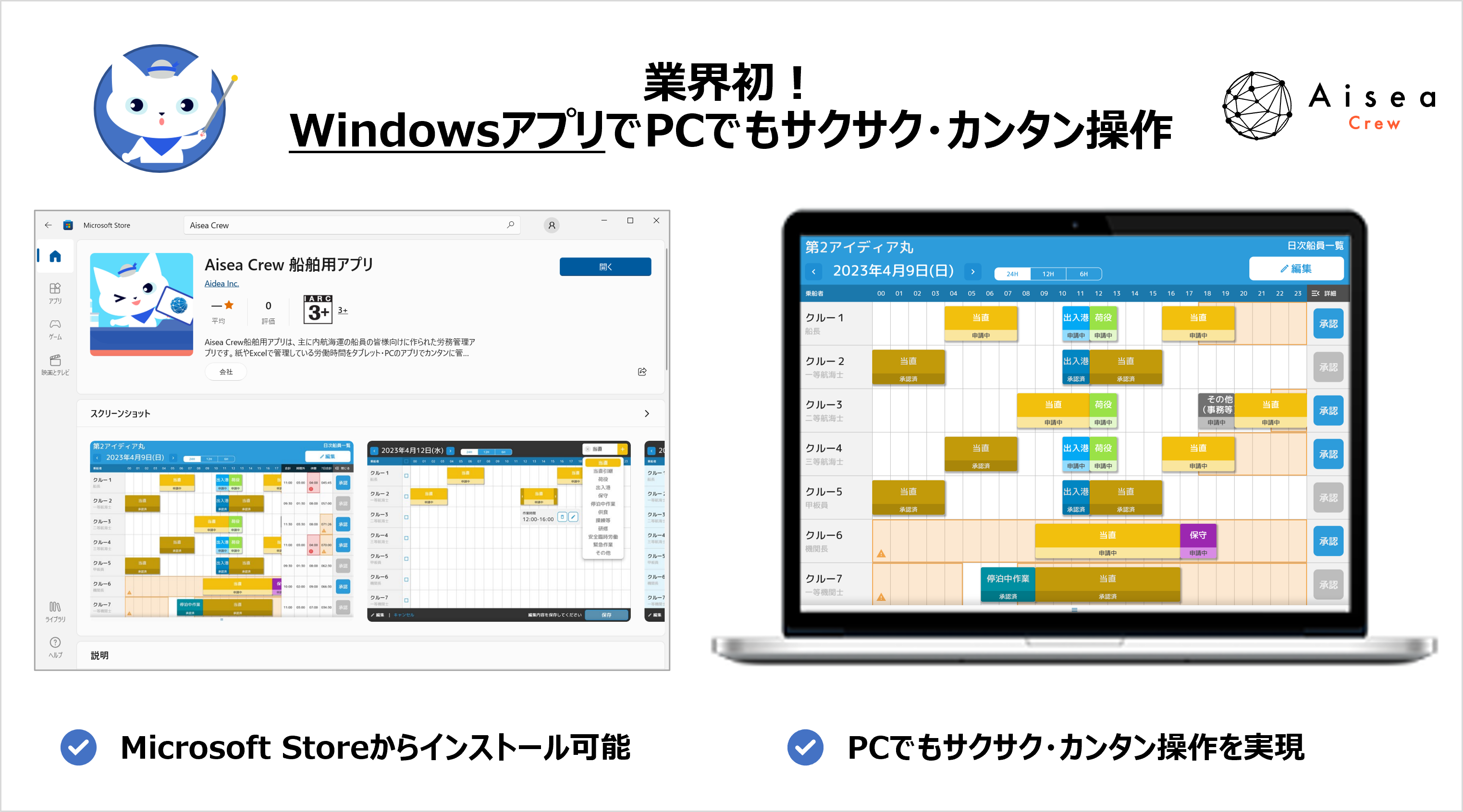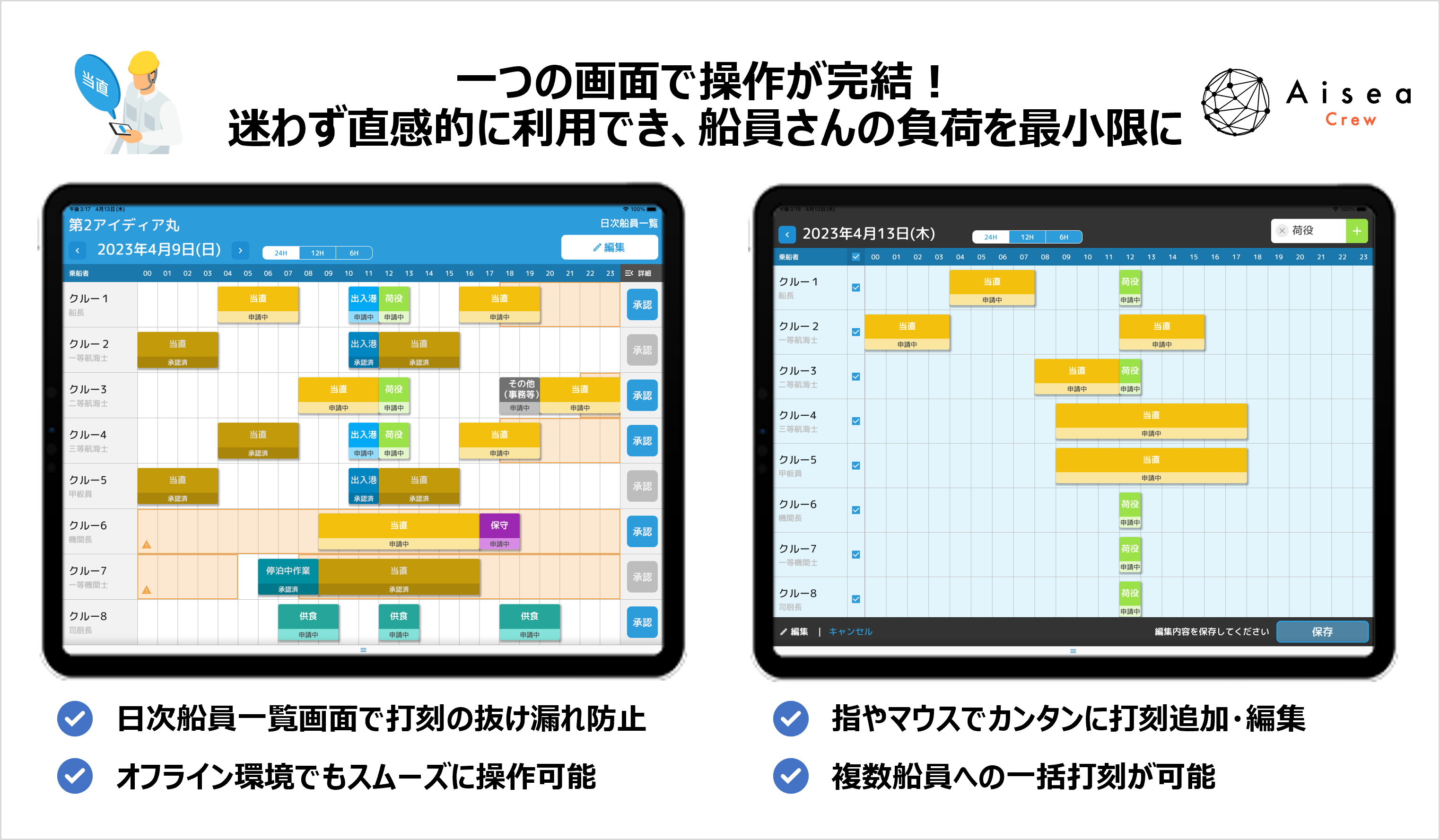 当社が提供する労働時間管理システム『Aisea Crew』は、船員向け打刻アプリと陸上管理者向けWebシステムの連携により、カンタンかつ適切な船員労務管理を実現するサービスです。機能を最小限に絞り、ボタンタップのみで簡単に操作できるスマートフォンアプリに強みがあり、サービスリリース以来多くのお客様にご利用いただいております。その中で、タブレットやPC等の共有端末でもAisea Crewを利用したい、という声を多くいただき、船舶用アプリの開発に着手しました。Aisea Crewの強みであるシンプルで分かりやすいシステムを追求しつつ、お客様からのフィードバックを反映することで、船員の皆様にとって使いやすいアプリを開発することができました。タブレットはiOS、Android共に対応、PCはMicrosoft StoreからインストールするWindowsアプリとしてリリース致しました。