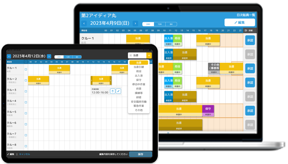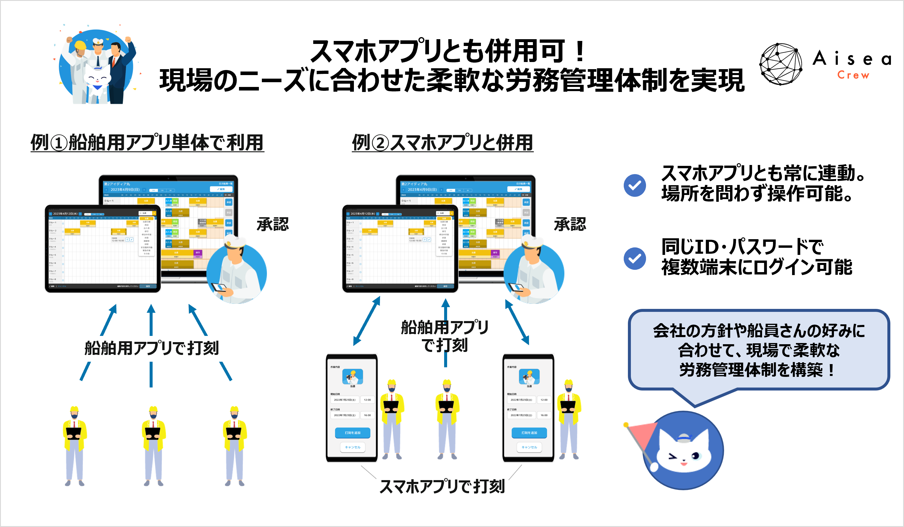 船舶用アプリは、タブレット・PC等の共有端末単体でのご利用に加えて、既存のスマートフォンアプリとも連携しており併用することが可能です。各船員の打刻はスマートフォンアプリで日々行ってもらい、船長等の権限者が船舶用アプリで打刻内容を一覧で確認するなど、会社ごとの方針や現場のニーズに合わせて、船舶用アプリとスマートフォンアプリを組み合わせて柔軟な運用体制を構築することができます。