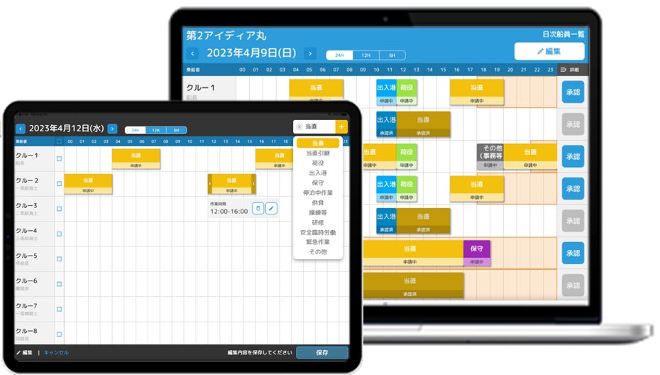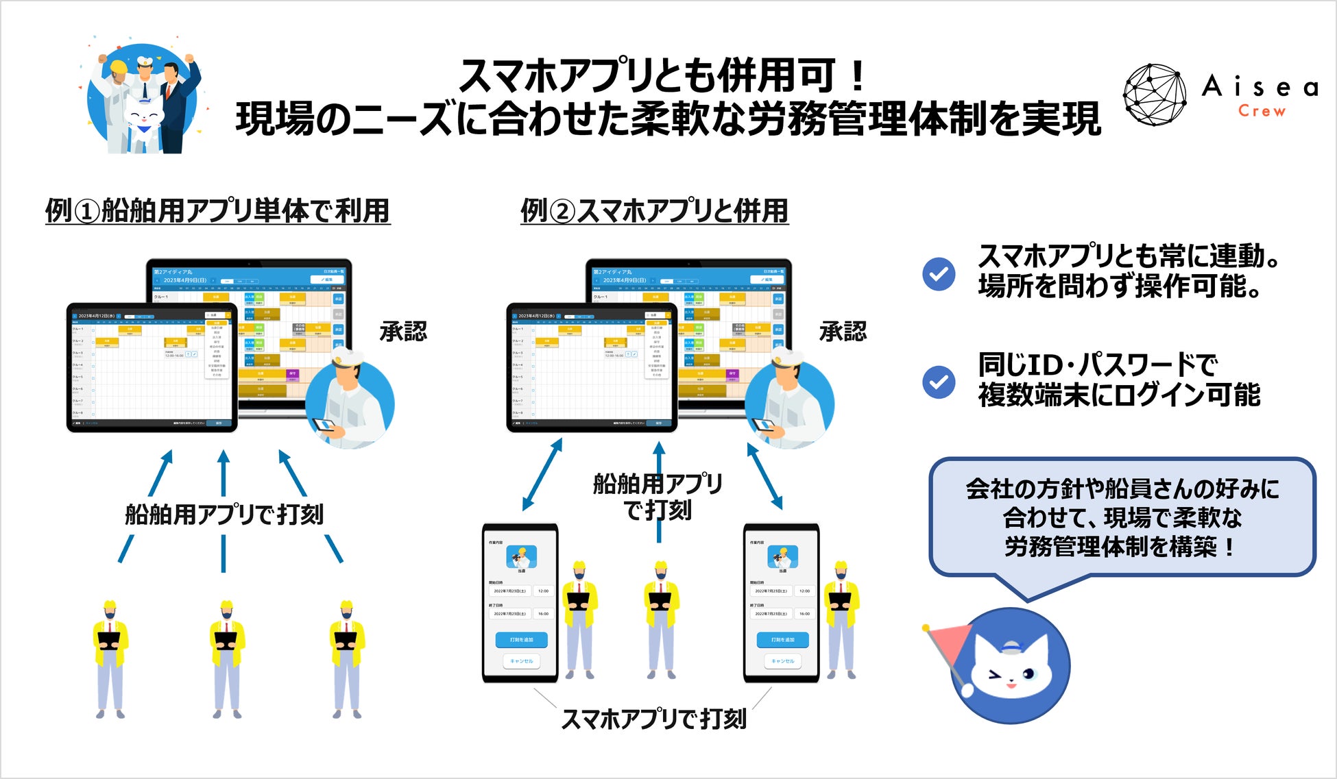 - 船舶用アプリとスマートフォンアプリは常に連動。場所を問わず打刻・承認が可能。