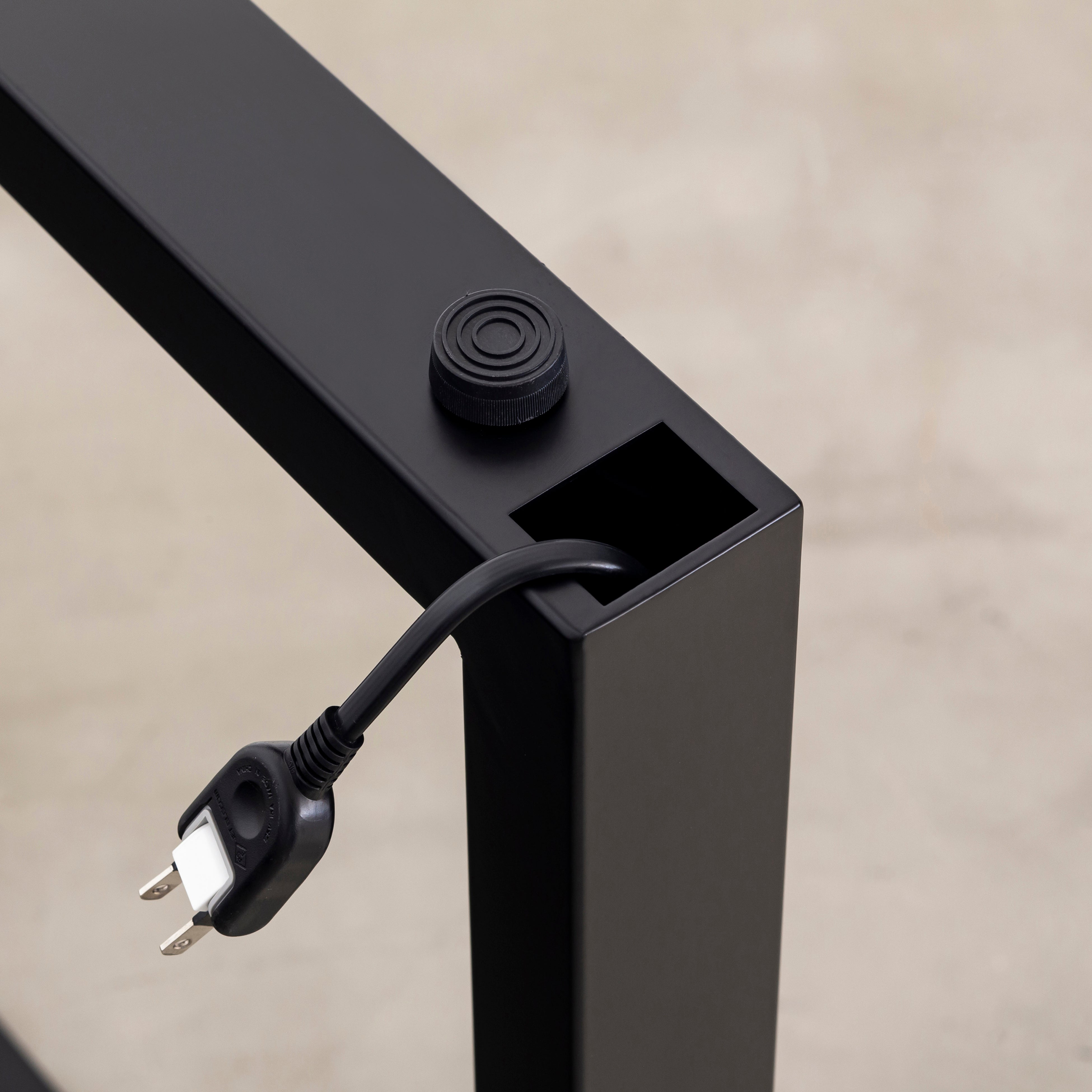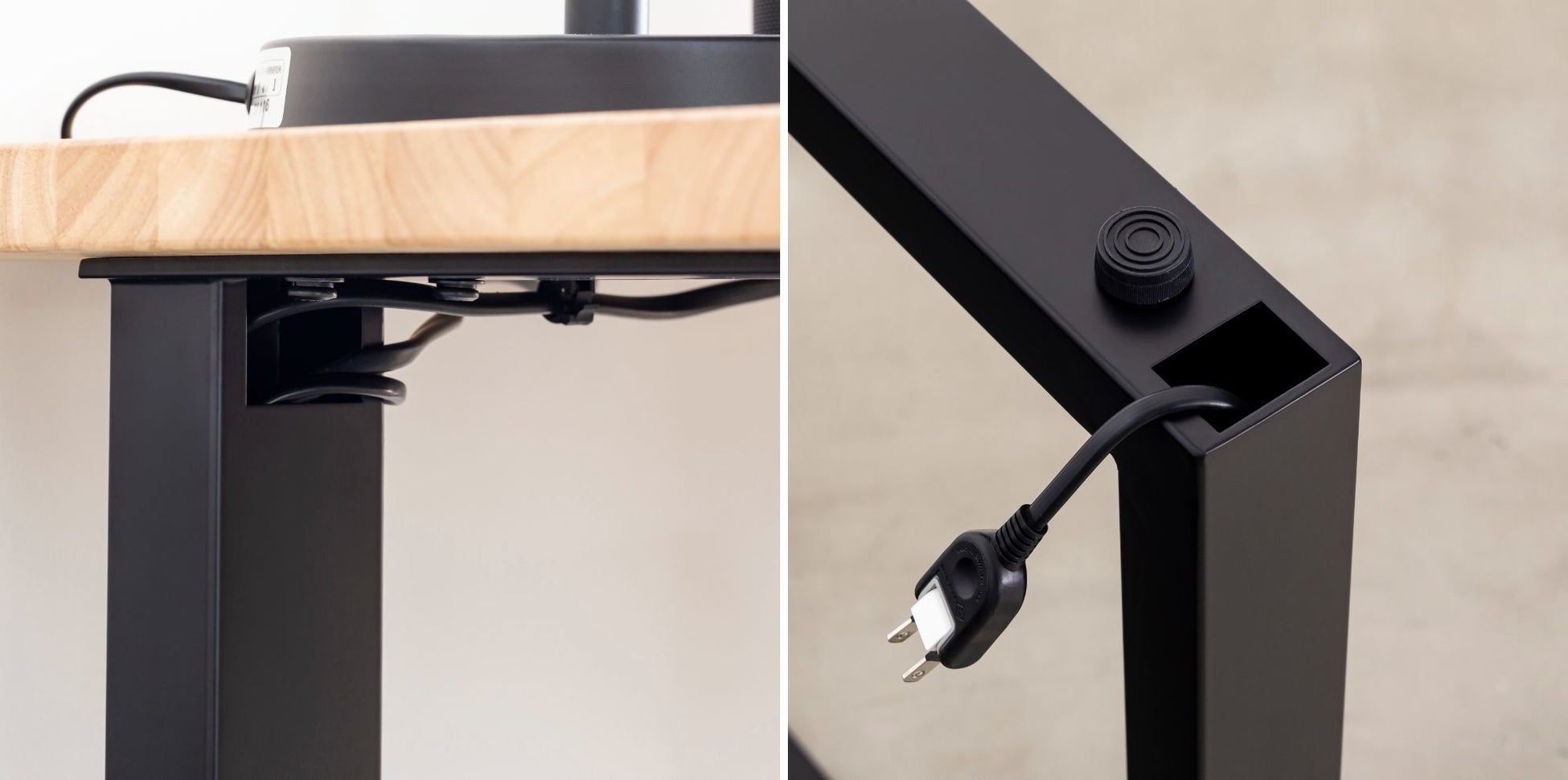 今回発売する「THE LEGS / スクエア 配線孔付き × Black Steel / 2脚セット」は、機能性に特化した新しいデザインです。一見すると通常のスクエア脚と同じですが、アイアン脚の中に幅 40 × 奥行 30 mm の穴が空いており、そこにケーブルをまとめて通すことができます。