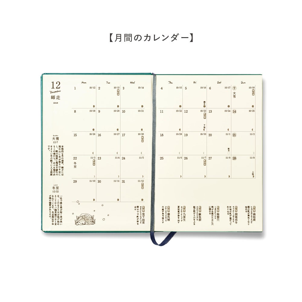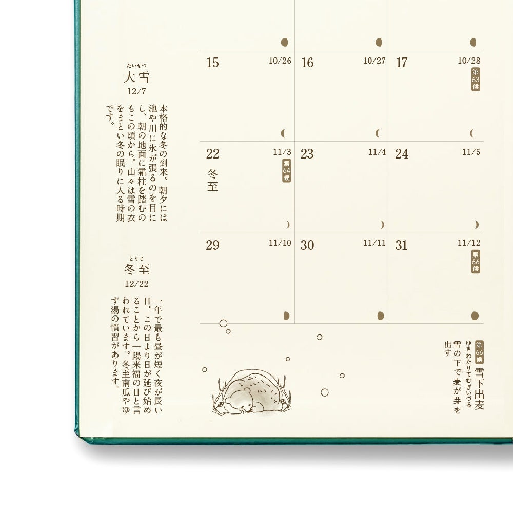 季節を感じられる「二十四節気」「七十二侯」「雑節」「土用の入り」を盛り込みました。さらに、旧暦と月の満ち欠けも加えています。月間のスケジュールも書ける仕様です。