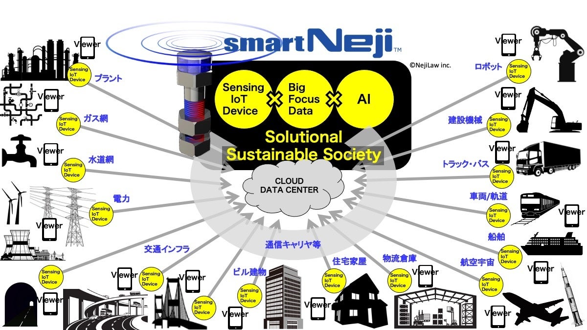 smartNejiシステムの実装対象は、工場、プラント、発電所、送電網、水道網、ガス管網、鉄道網、道路網、自動車、大型車両、船舶、航空機、ロケット、ロボット、産機、建機、ビル建物、住宅家屋等広範囲に及び、それらの構造体の健全性をAIシステムによって可視化することができるようになります。