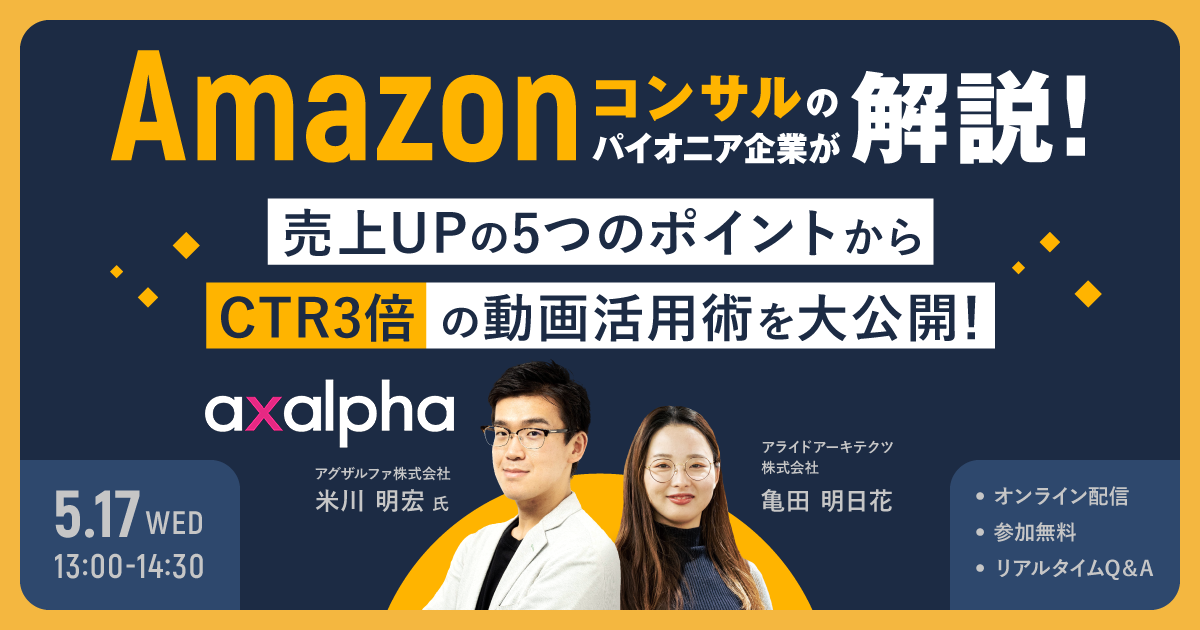 Amazon専門コンサルティングを展開するアグザルファ、アライドアーキテクツ共催セミナー「Amazonの売上を伸ばす5つのポイント、CTR3倍の動画活用術まで大公開!」登壇のお知らせ【5/17開催】