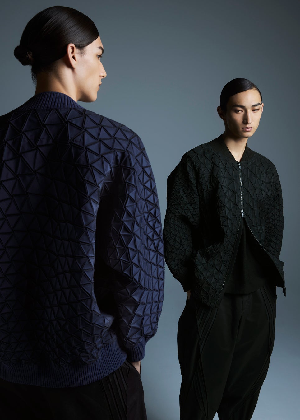 プロトタイプ発表から2年の開発期間を経て、ついに商品化が実現しました。このプロダクトでは、衣服のデザインに必要な要素をあらかじめ一枚の布に織り込み、熱を加えることで布を収縮させ、立体的なプリーツ形状を生み出すイッセイ ミヤケのスチームストレッチ技術と、Nature Architectsが開発した、狙った立体に変化する折り図を自動生成するアルゴリズムを融合させました。その結果、フラットな一枚のパーツが立体的なフォルムへと変化する、これまでにない革新的なブルゾンが誕生しました。布の可能性を最大限に引き出し、着る人の動きに呼応するダイナミックなフォルムと緻密な構造が特徴です。