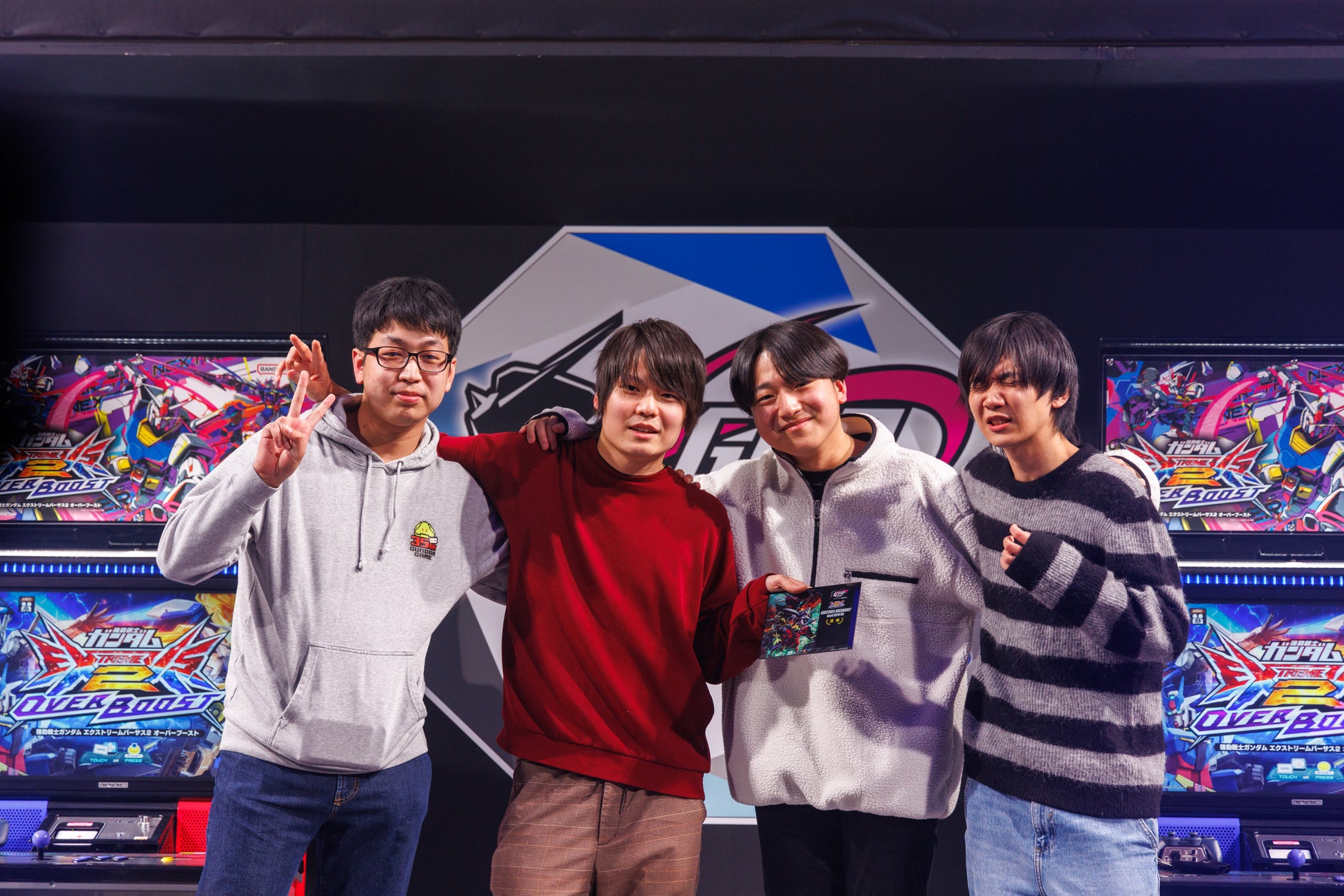 先鋒戦、大将戦の勝利数は1対1となり、勝負はエクストラバトルまでもつれ込みました。先鋒戦に勝利した【雨宮家族】祈り選手の「ガンダムダブルオースカイ」、らるく選手の「クロスボーン・ガンダムX2改」選手 、【伊藤副店長】こざやま選手の「ガンダムダブルオースカイ」、ちゃんるい選手の「ジ・O」が対戦。らるく選手の心の強さが際立つ試合展開で【雨宮家族】が勝利し、見事、OVERBOOST 4on4 団体戦の優勝の座を手に入れました。