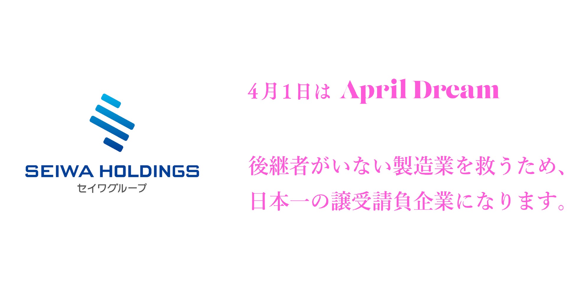 製造業を中心とした「中小企業の後継者不足」という社会問題を、事業承継で解決し、日本のモノづくりや職人の技術を守るべく邁進している、株式会社セイワホールディングス(本社:愛知県名古屋市、代表取締役:野見山 勇大)はAprilDreamに参加しています。このプレスリリースは、私たちのApril Dreamです。