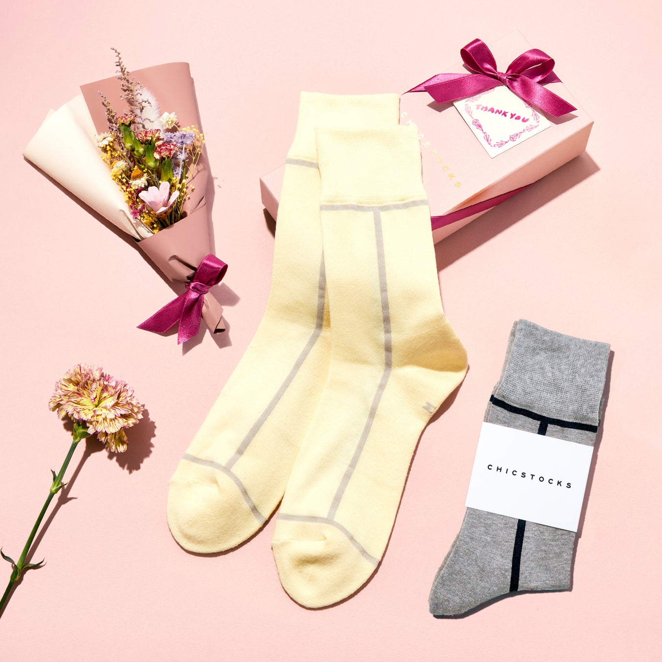 ソックスブランド「CHICSTOCKS(シックストックス)」では、母の日におすすめのギフトセットを4月4日(金)より発売します。靴下とドライフラワーのミニブーケを組み合わせ、スモークピンクのボックスでラッピングした華やかなギフトセットです。靴下には季節感のある新色が加わり、贈る相手に合わせて10色からお選びいただけます。
