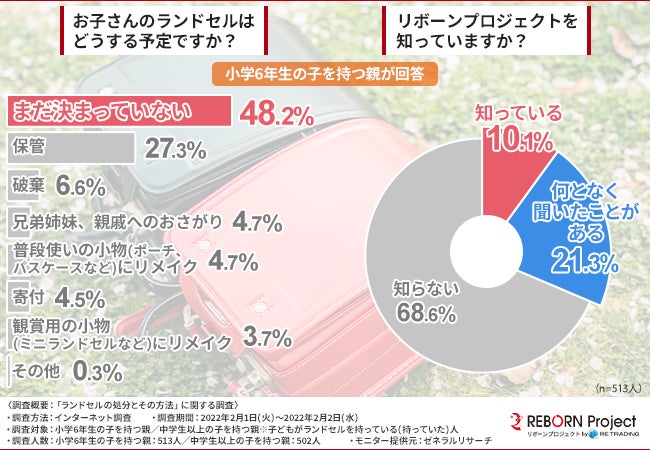 そこで今回、リボーンプロジェクト(https://www.kataduke-kaitori.com/reborn/)を運営する、株式会社GoodService(https://www.kataduke-kaitori.com/)は、小学6年生の子を持つ親と中学生以上の子を持つ親を対象に、「ランドセルの処分とその方法」についての調査を実施しました。