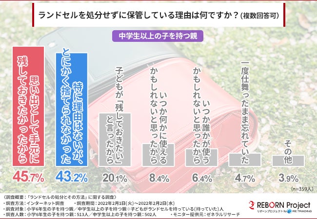 その一方、捨てることに抵抗感を覚え、結果的に捨てられず今に至っている方の割合もほぼ等しかったことから、ランドセルというアイテムに対して多くの親が特別な思いを持っていることが窺えます。