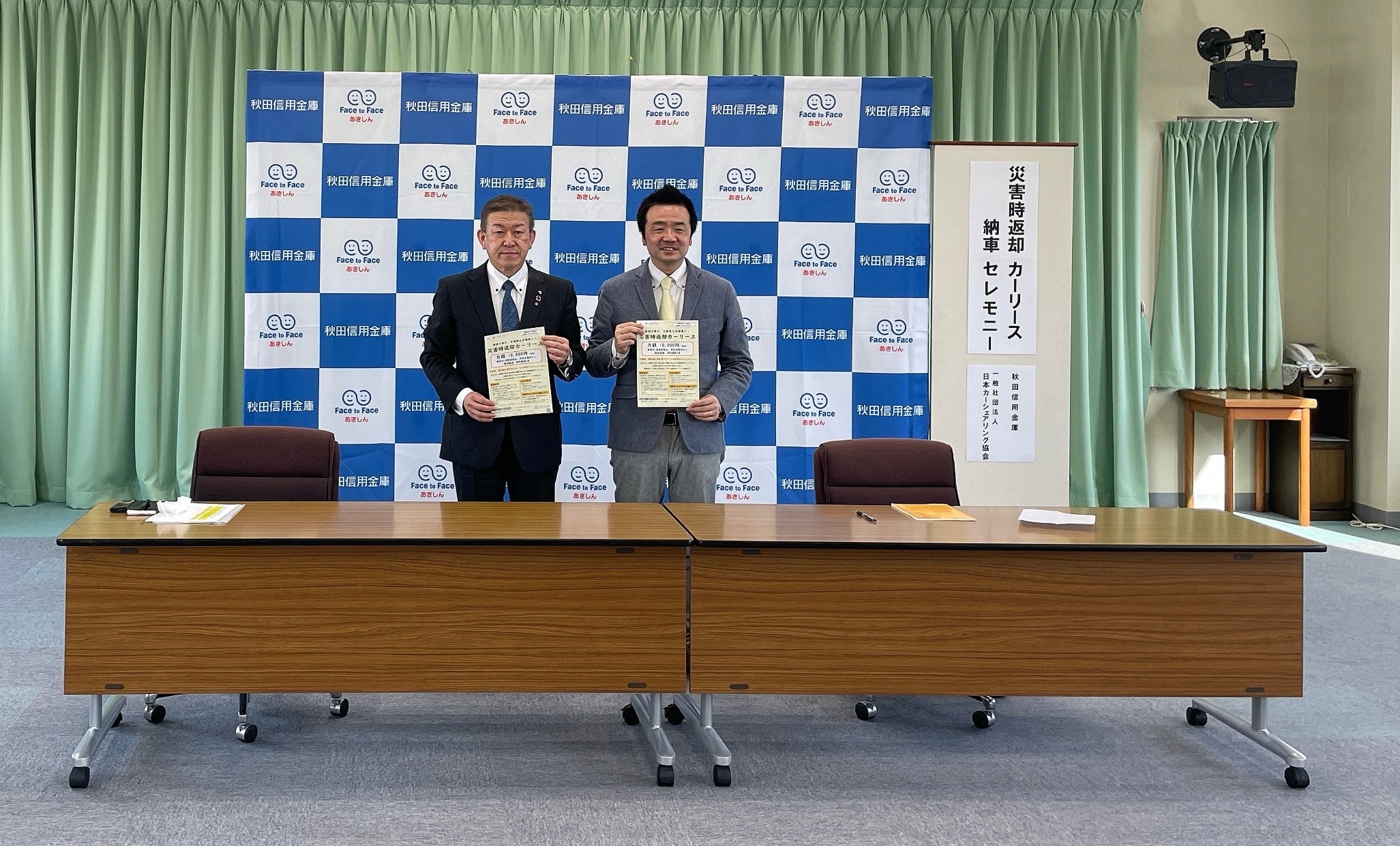 秋田県内での災害時返却カーリースの納車は今回が初めてです。また、金融機関として本サービスの利用を導入したのは石巻信用金庫に次ぐ2例目となります。